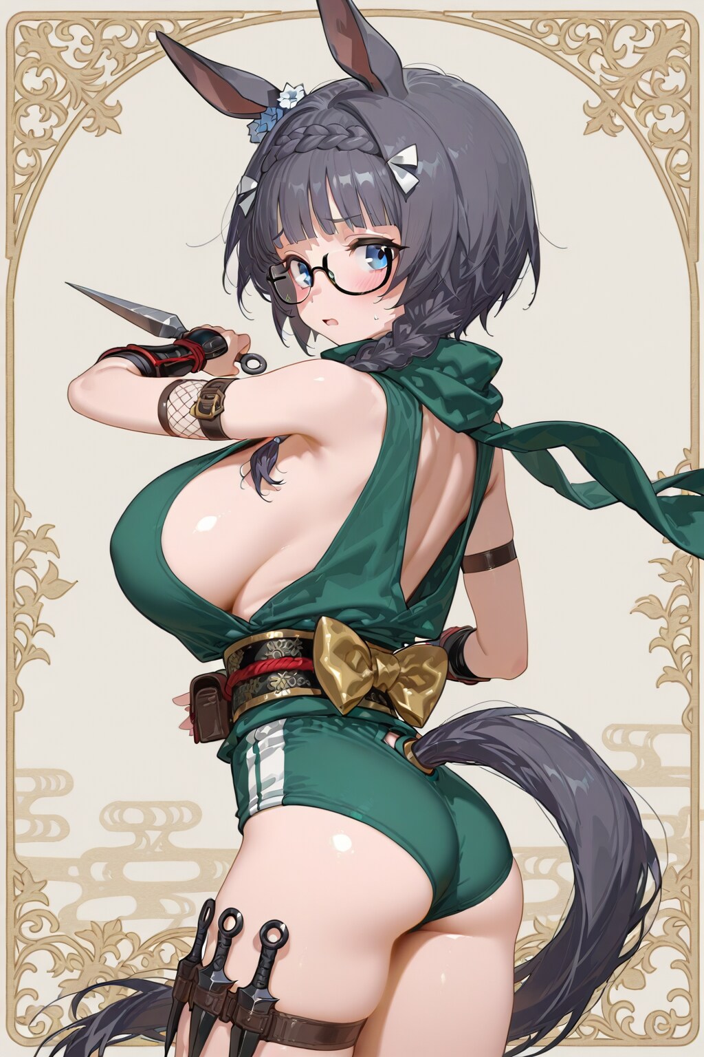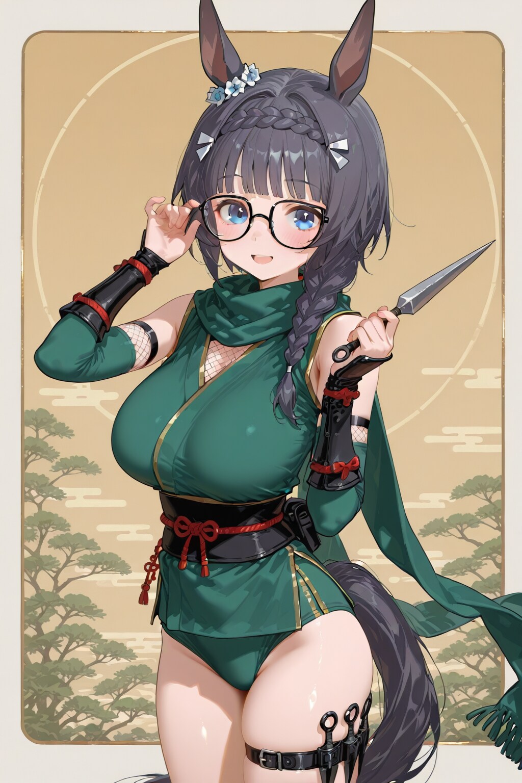 忍者装束+ブルマという絶妙なミックス具合がたまらない忍ルマを誰にやってもらおうか、と思ったところ思い立ったのがウマ娘のゼンノロブロイの新衣装候補?として作ってしまうというもの。試しに作ってみたらいい絵というよりは作ってて楽しいという感じになりまして気がついたら15枚ほど作っておりました(苦笑)。
