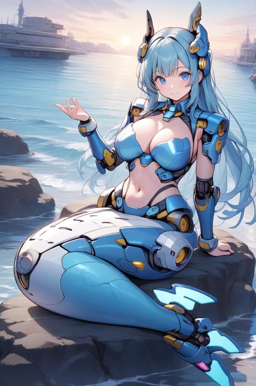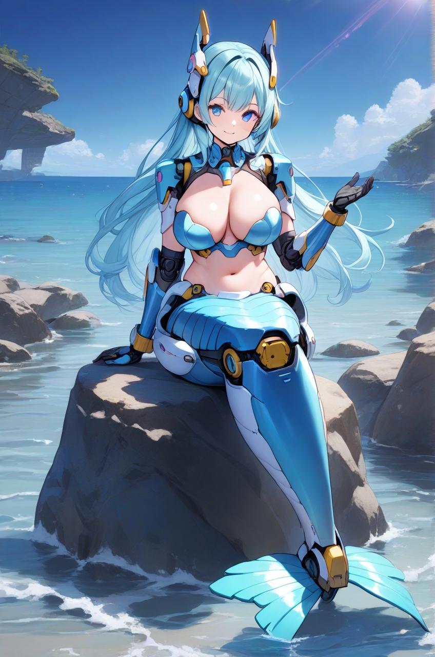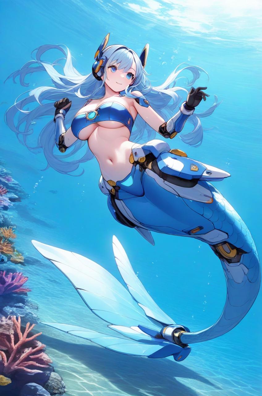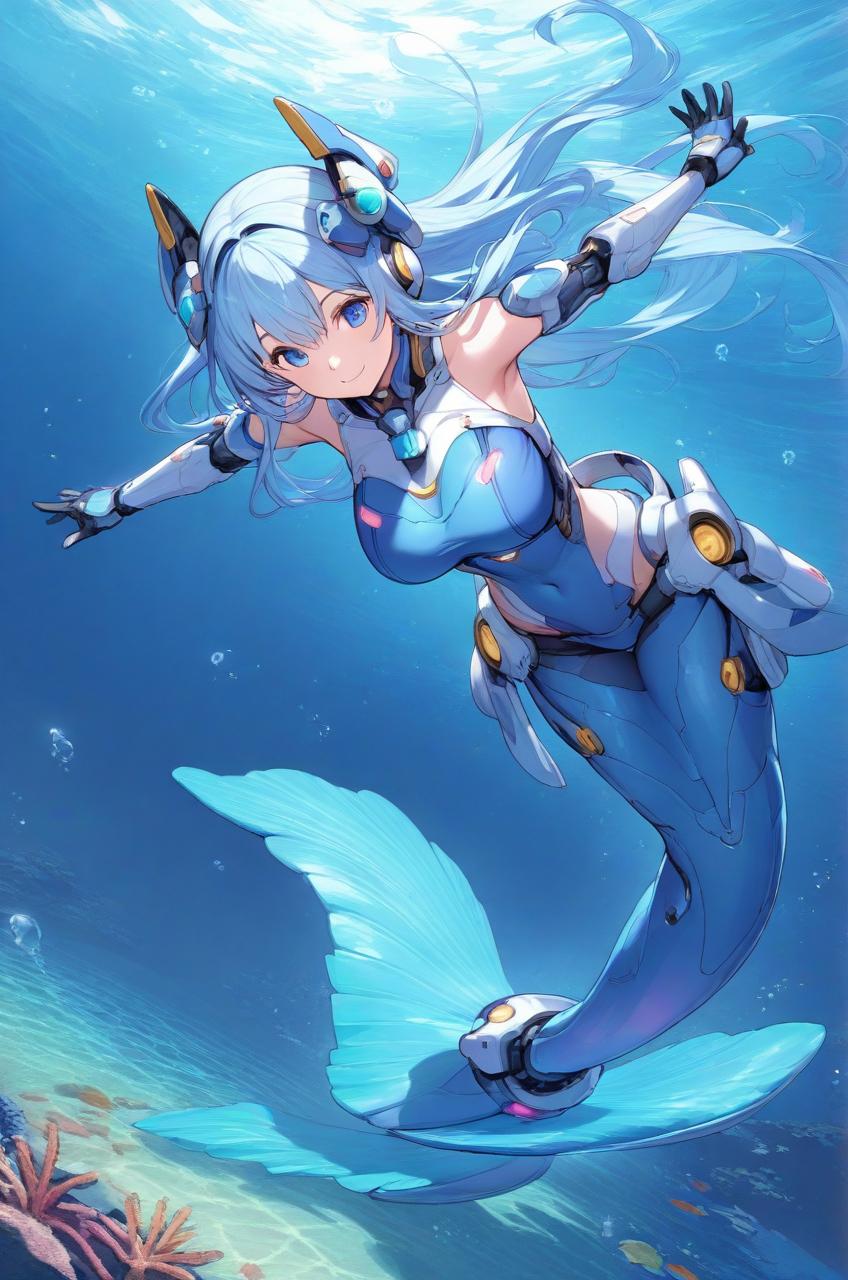 水色のロング髪とメカニックなヒレが特徴のマーメイド型アンドロイド。