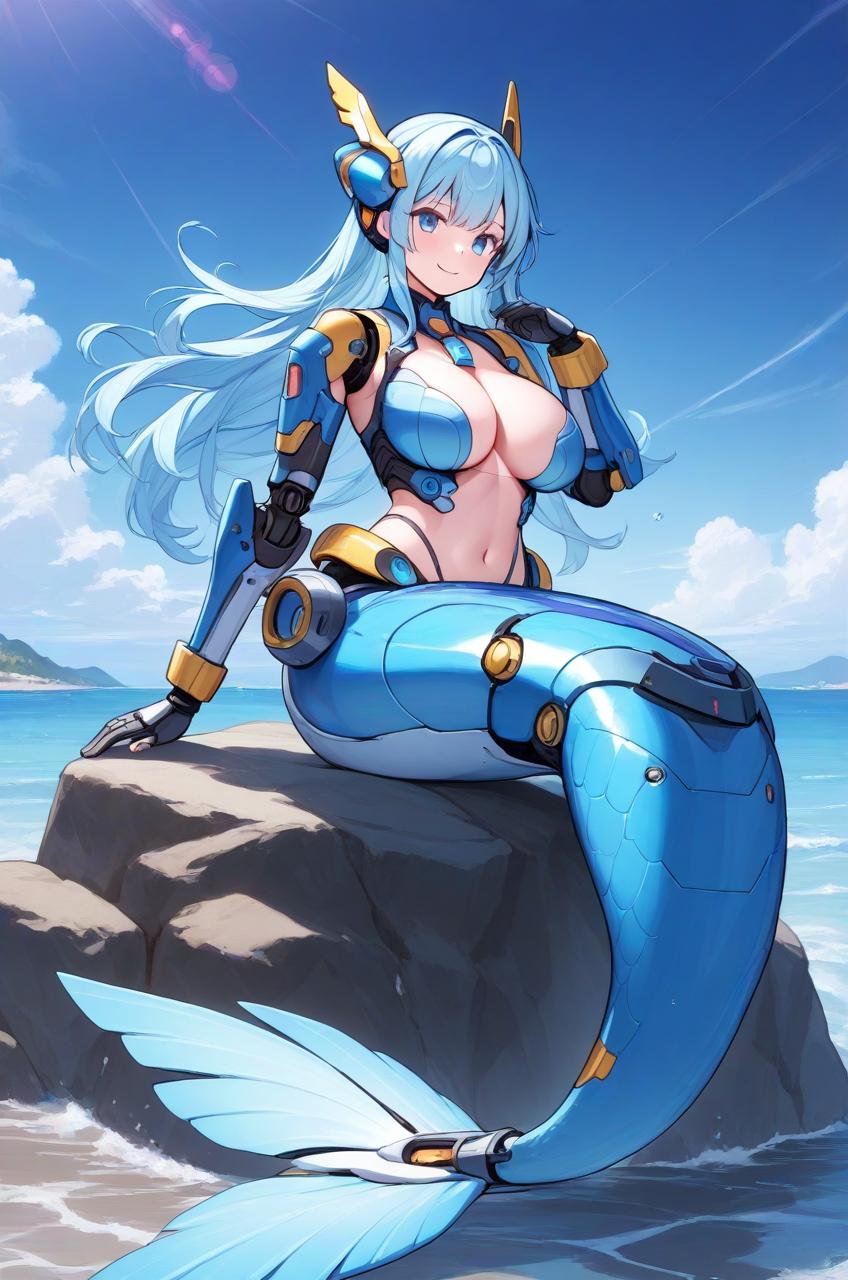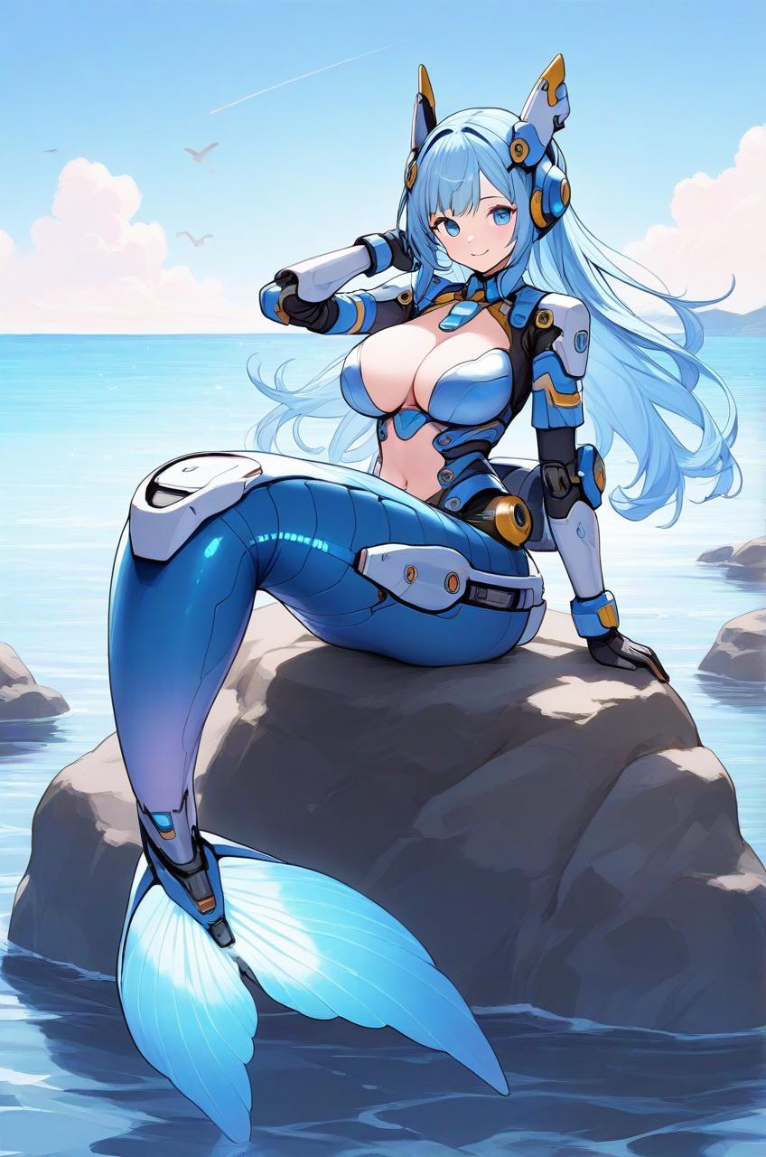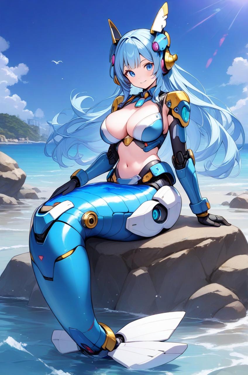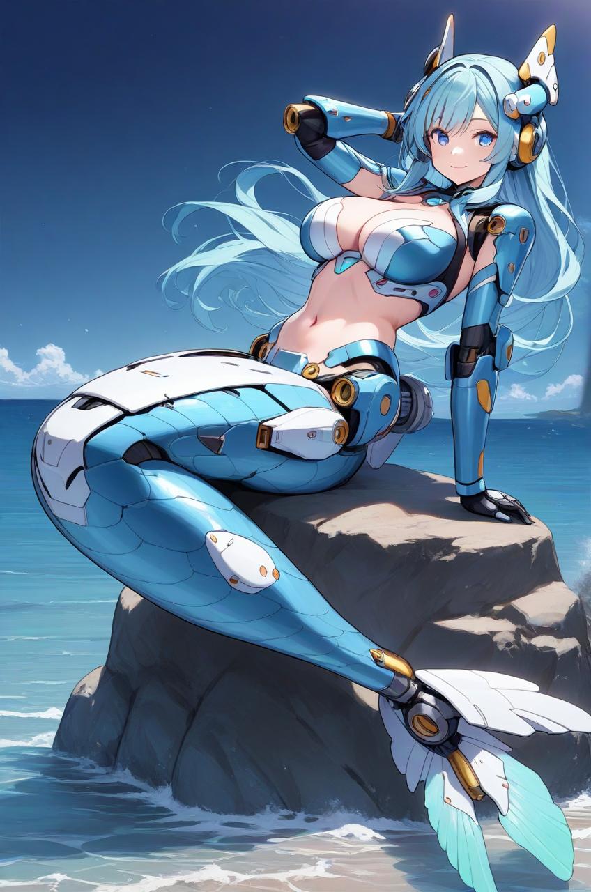 水色のロング髪とメカニックなヒレが特徴のマーメイド型アンドロイド。