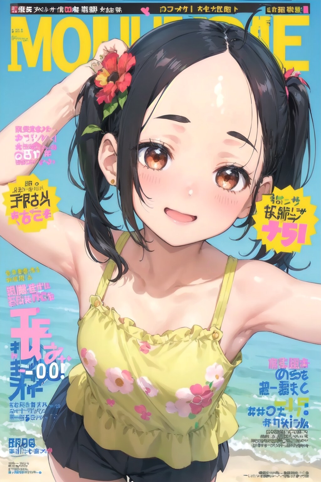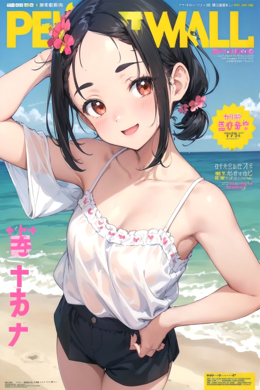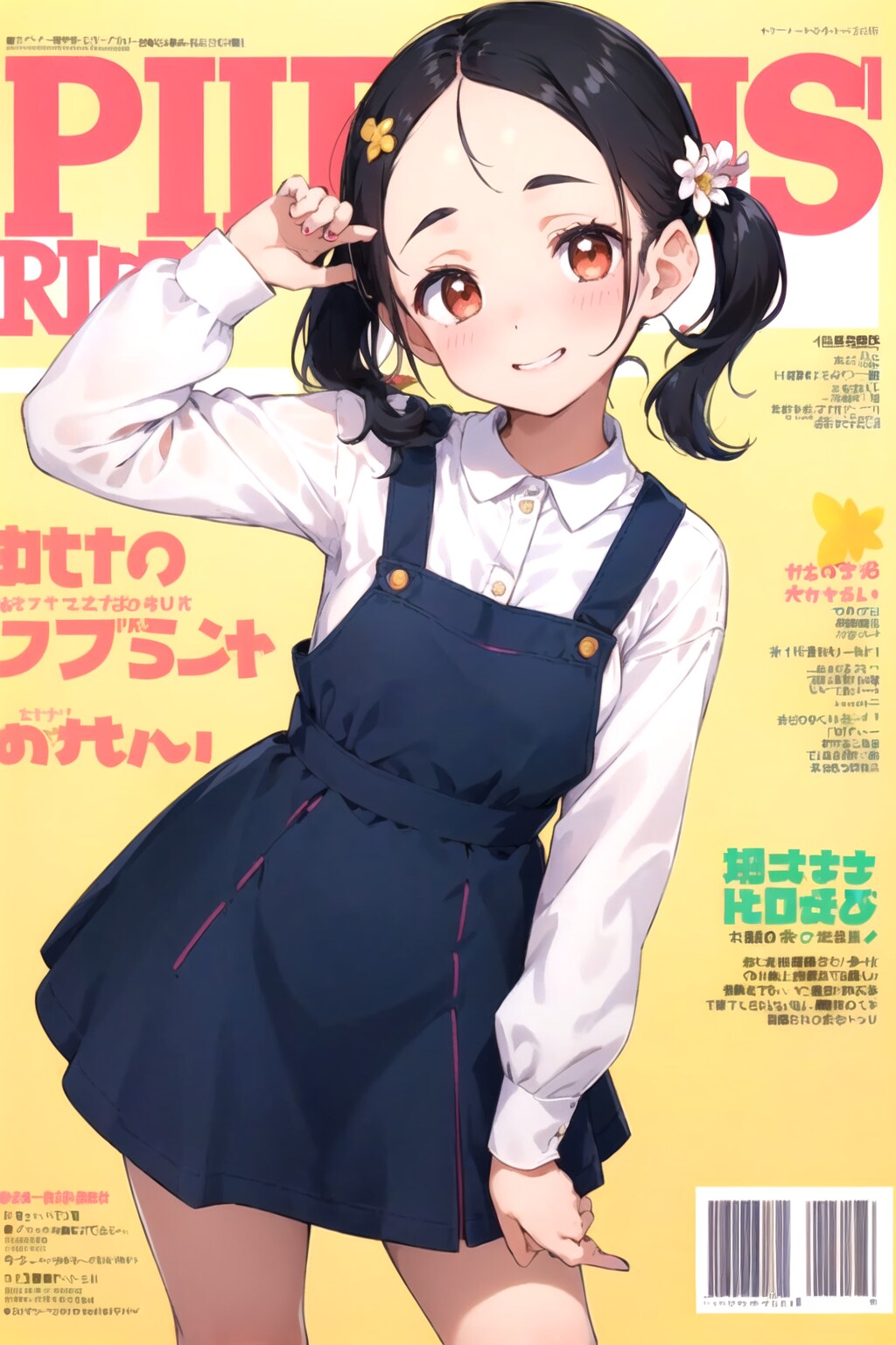 お題箱のお題でつくったおでこちゃんです。12枚のうち、衣装はキャミソール+キュロットとシャツ+ジャンスカの2パターンです。プロンプトはシャツ+ジャンスカのものです。