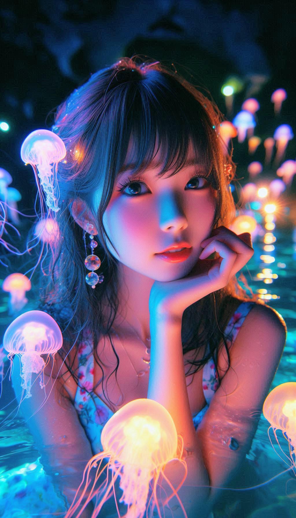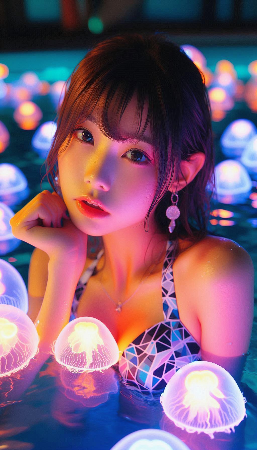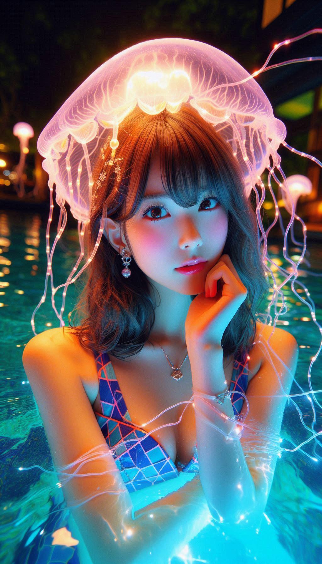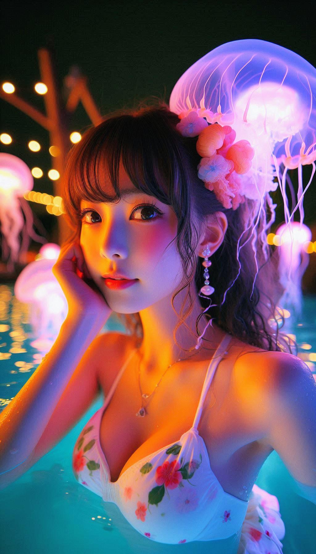 夏休みにうちで飼ってるクラゲとナイトプールに行った時の写真です🪼