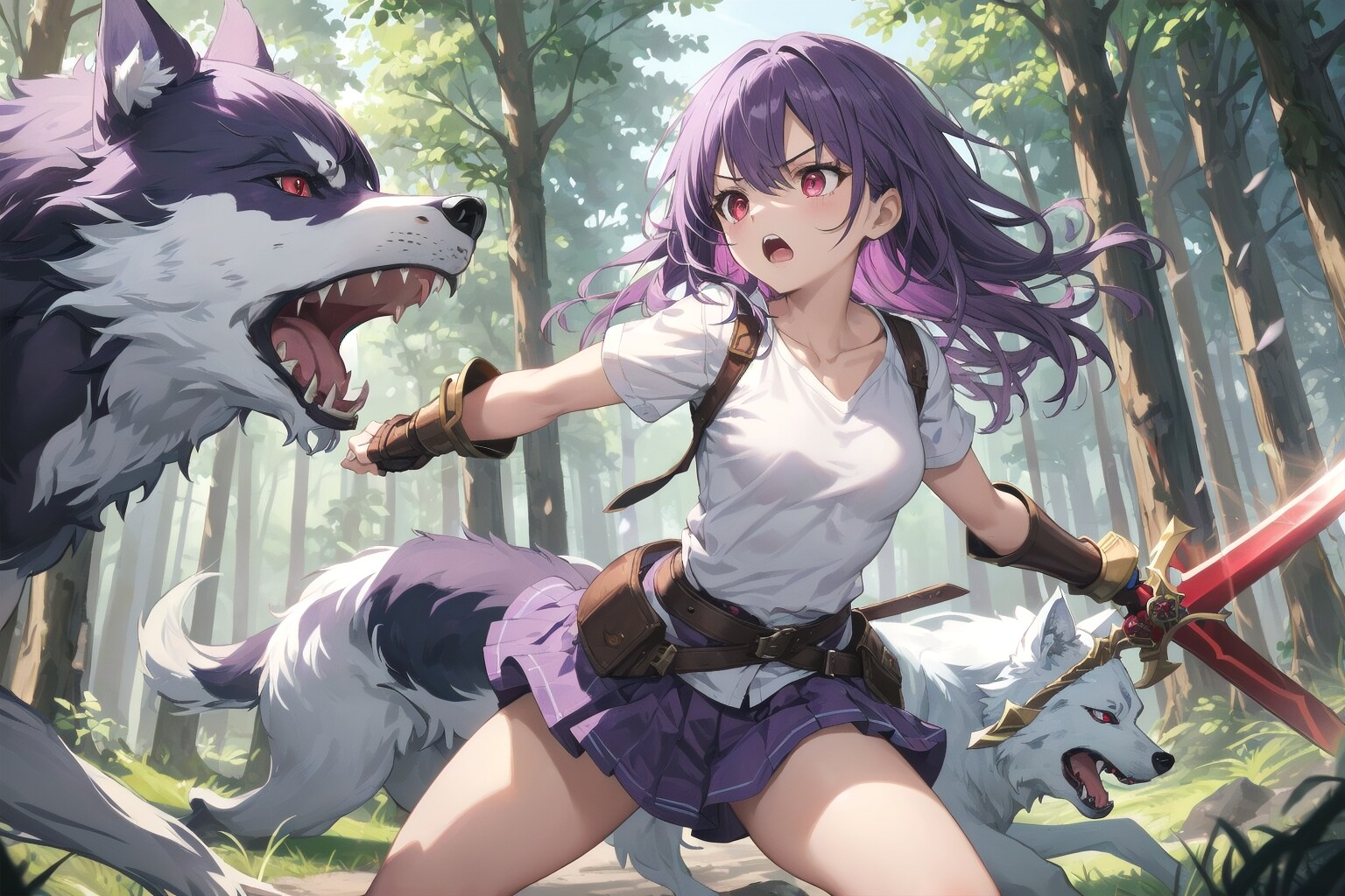 初心の冒険者が、狼たちの狩の対象になってしまった。1対1なら、勝てるけど…狼の得意な戦術、集団での狩に翻弄され奮闘する場面を表現しました。