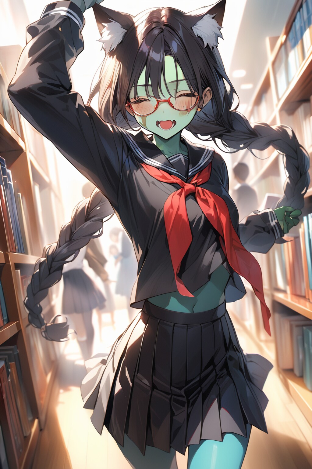 猫乃つづりさんのトモダチにシタイにゃ企画参加投稿です。要するにゾンビ企画なのですな、ということで眼鏡三つ編み好きにかかれば「ゾンビも眼鏡三つ編み」でございます。まあそういうゾンビは元々いても全然おかしくはないんですが(苦笑)。持たせた本もゾンビの雰囲気に引きずられたか不気味そうな装丁の本として生成されてきてますしなかなか面白い題材だなと感じますね。