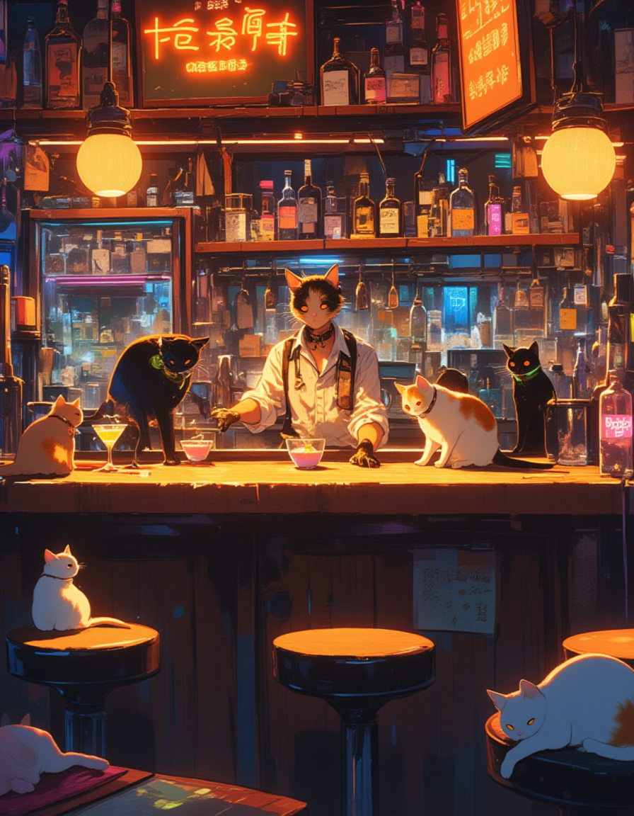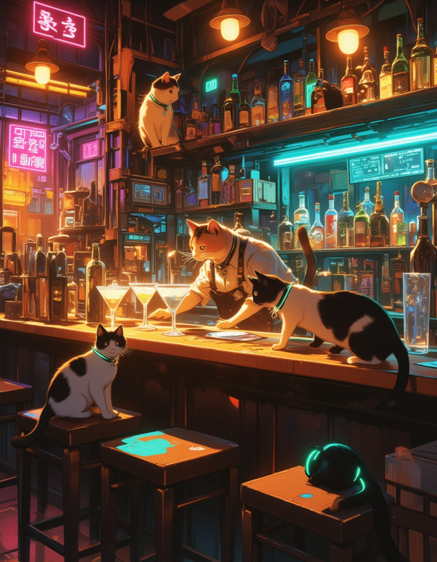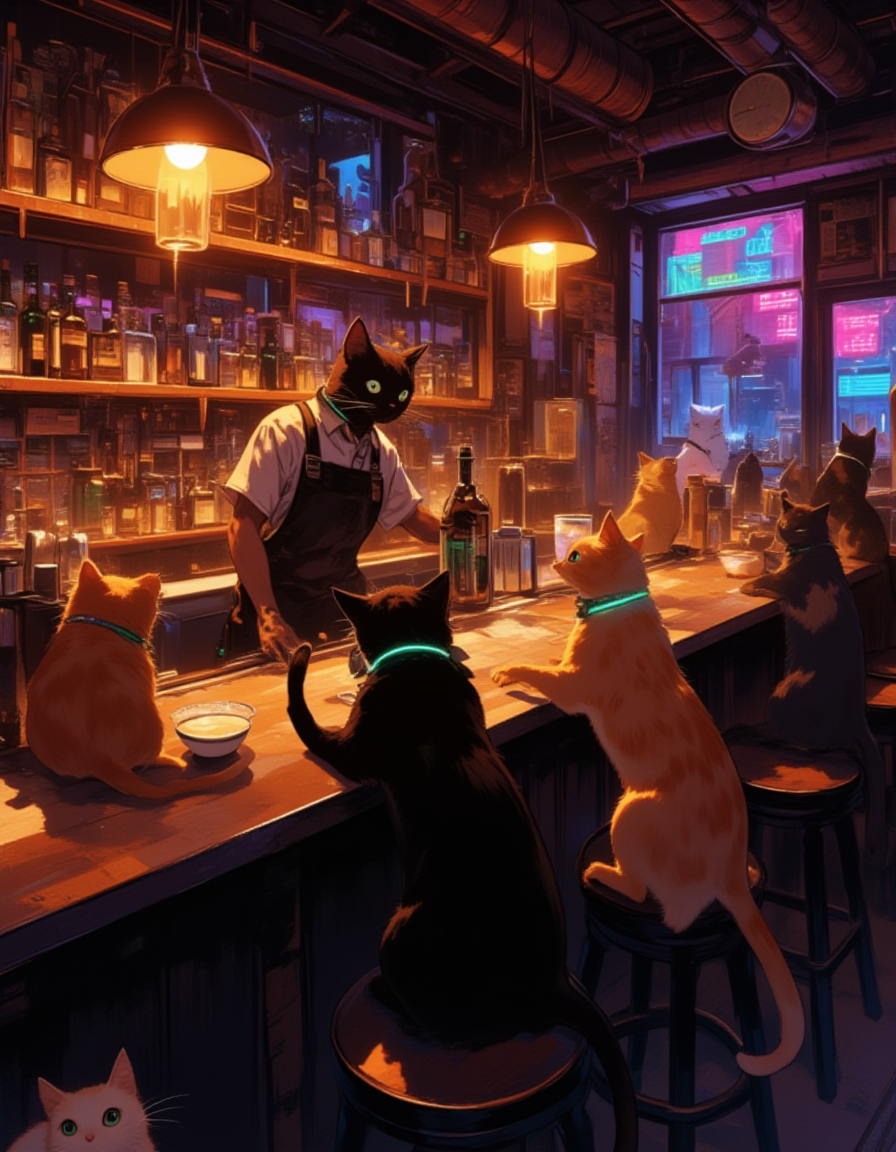 Situation: A lively or serene bar scene where regular cats take on the roles of bartenders or customers in a whimsical,yet grounded setting. The bar has a warm wooden interior for a cozy vibe or neon-lit decor for a cyberpunk aesthetic,with shelves of glowing bottles,cocktail glasses,and bar tools. Cats interact naturally with the environment,creating a playful and surreal atmosphere.Characters: A variety of cats with distinct appearances—tabby,Siamese,black,or calico—each with unique fur patterns and expressive eyes. One cat is perched behind the bar,nudging bottles or "serving" drinks,while others lounge on bar stools or tables,lapping at small bowls of cream or water styled like cocktails.Clothing: No clothing,as the cats are non-anthropomorphic. Instead,some cats have natural accessories like collars with tiny bells or tags,or futuristic glowing collars for the cyberpunk vibe,adding personality without humanizing them.Color Palette: A warm,inviting palette for a cozy bar (rich browns, warm oranges, and soft creams) or a vibrant cyberpunk palette (neon blues, pinks, and purples with dark shadows). Glowing accents from bar lights or drink bowls (amber or green) enhance the mood.Style: A semi-realistic style with detailed fur textures and lifelike cat features,blended with a touch of whimsy to capture the surreal idea of cats in a bar. The aesthetic can lean toward a painterly,cozy realism or a sleek,cyberpunk-inspired look with glowing effects.Composition: A balanced composition centered on the bar counter,with one cat prominently positioned behind it and others scattered across bar stools or tabletops. Background details like bottles,glassware,or neon signs add depth without overwhelming the focus on the cats.Pose: The bartender cat is in a playful,curious pose—pawing at a bottle or nudging a glass with its nose. Customer cats are relaxed,some curled up with a bowl,others sitting upright or stretching lazily,their tails flicking or eyes gleaming with interest.Angle: A medium-wide shot at a low angle,close to the cats’ eye level,emphasizing their presence in the bar. The perspective highlights the bartender cat’s interaction with the counter while keeping other cats and the bar’s ambiance visible in the background.,