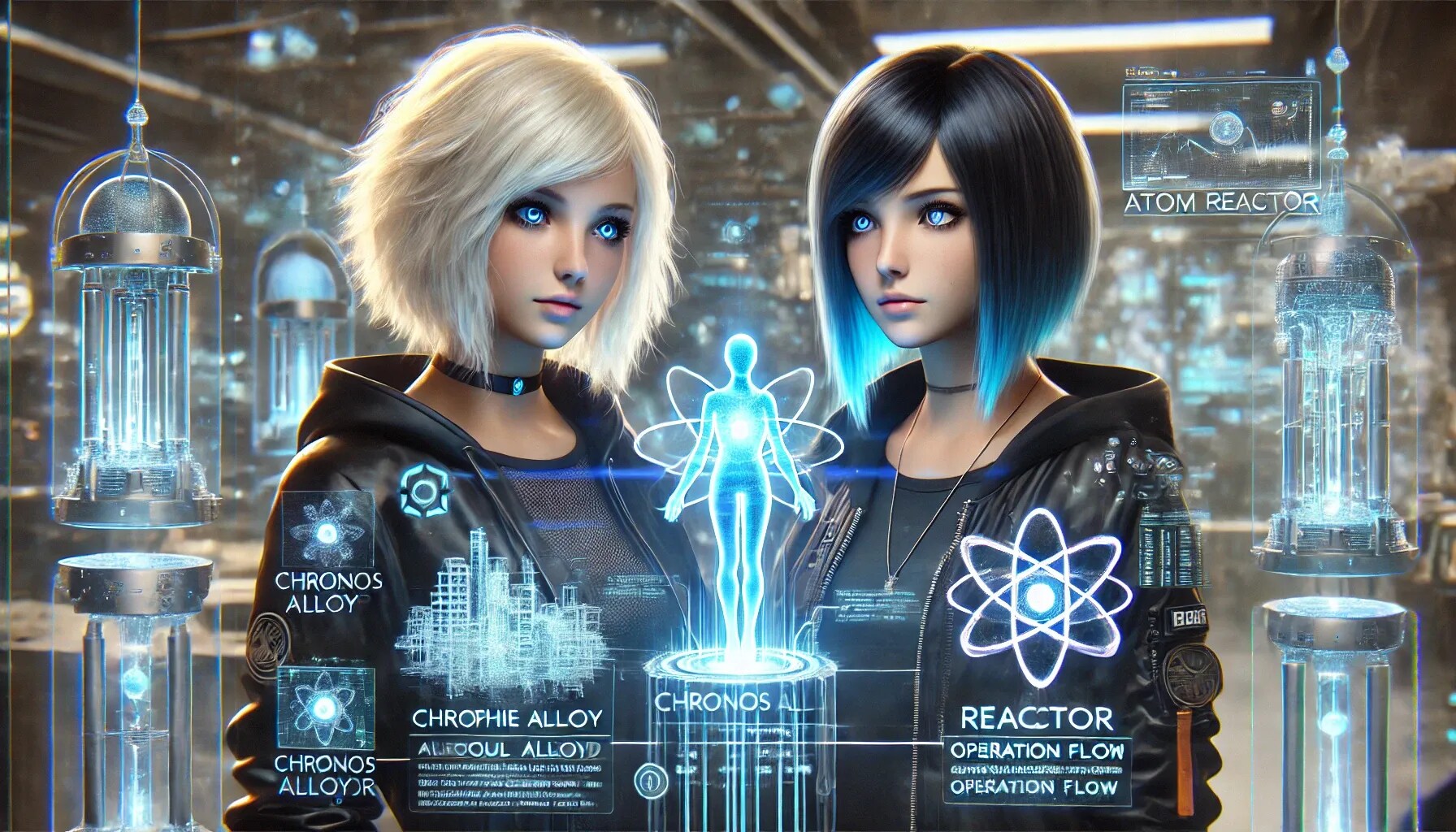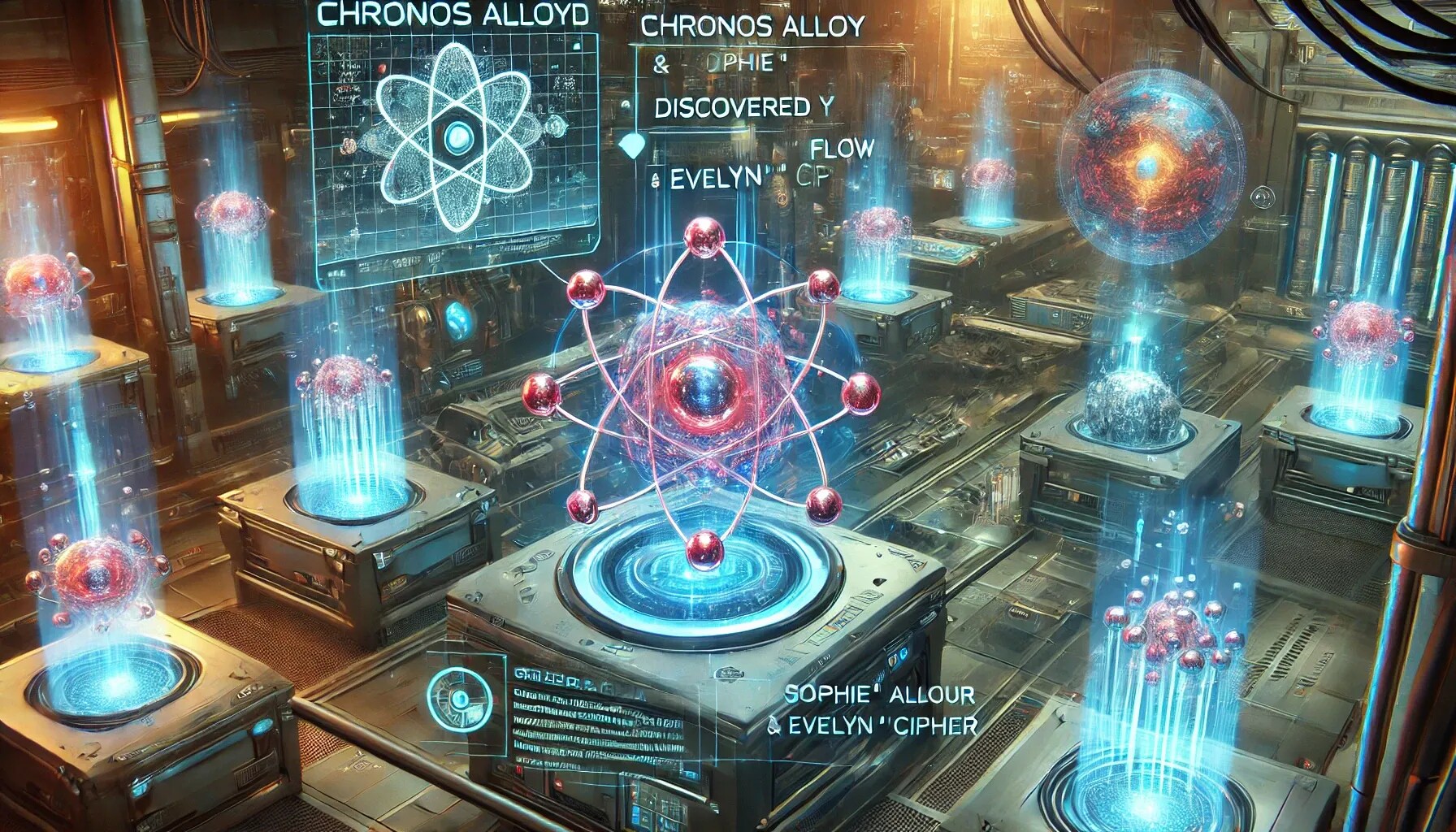 イブリンが円環構造を指さし、不思議そうに言います。「クロノス合金とアトムエネルギーって、なんだか昔のSF映画みたいだね。」