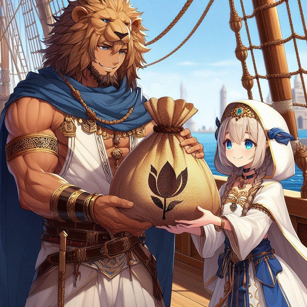 船上で、獅子王がシャルロッテにお土産の袋を渡している。