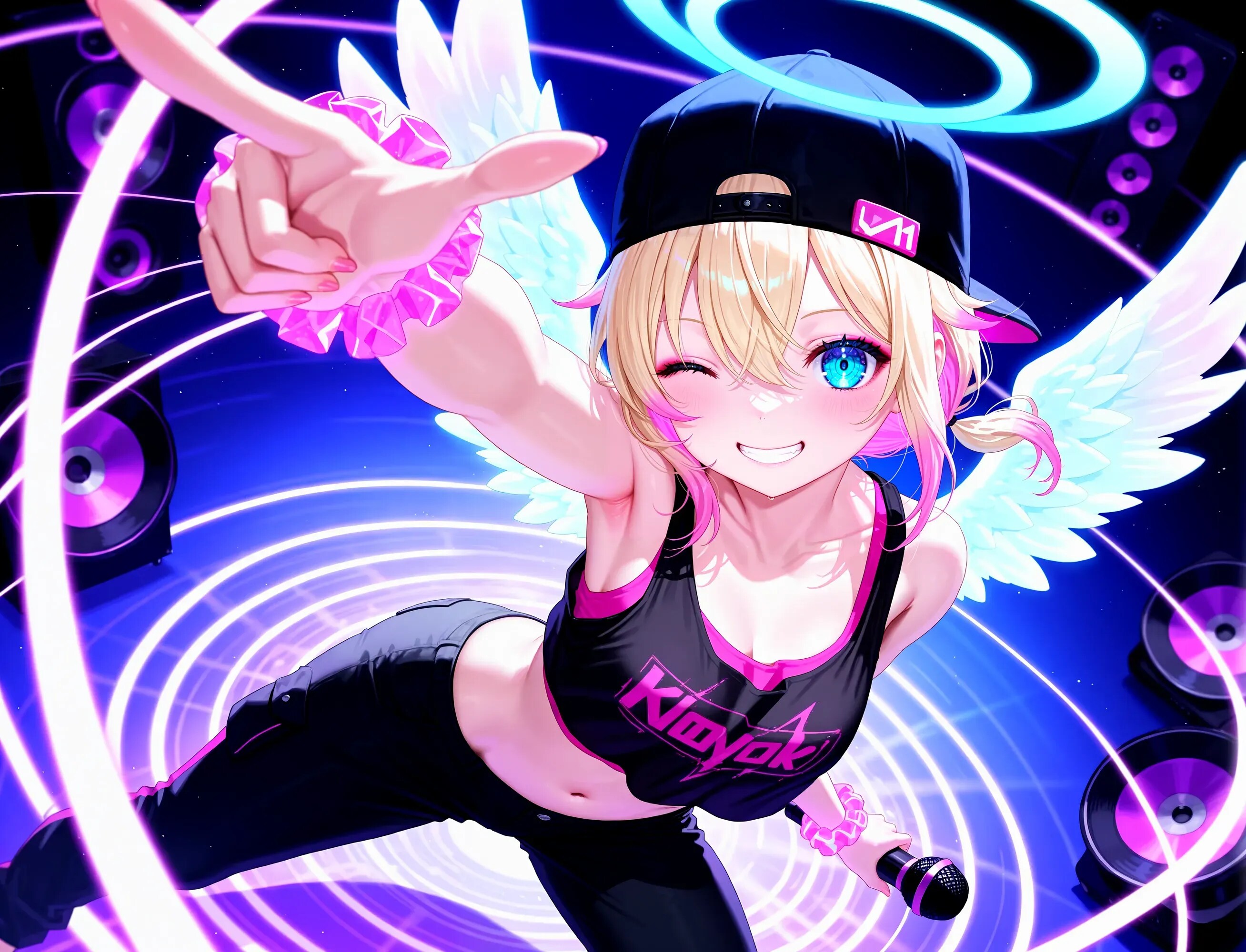 Fast tempo Hip Hop song with a bubblegum pop voice from a youthful female vocalist, bright synth melody, 808 bass, electronic drums and synthesizer, uplifting and cute atmosphere, danceable beat,