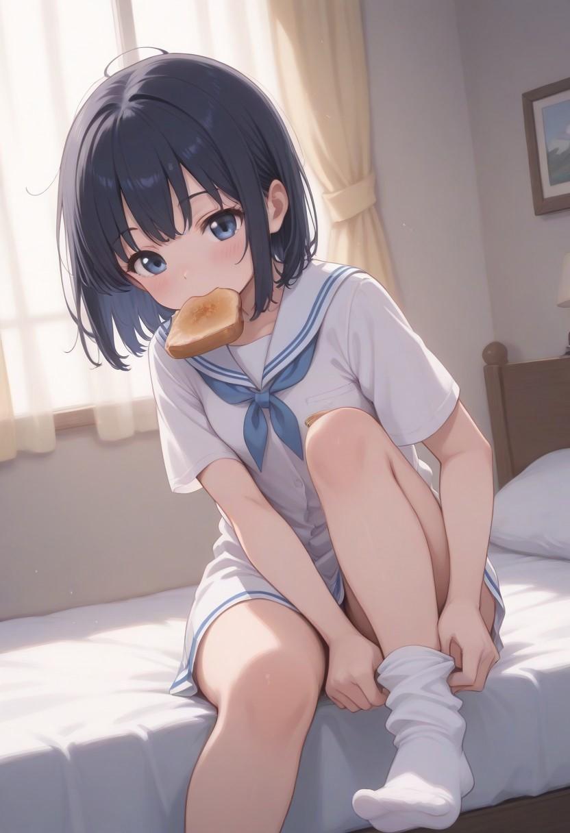 「ベッドに腰を下ろしてソックスを履く」+「トーストを咥えている」 に成功!(笑)
