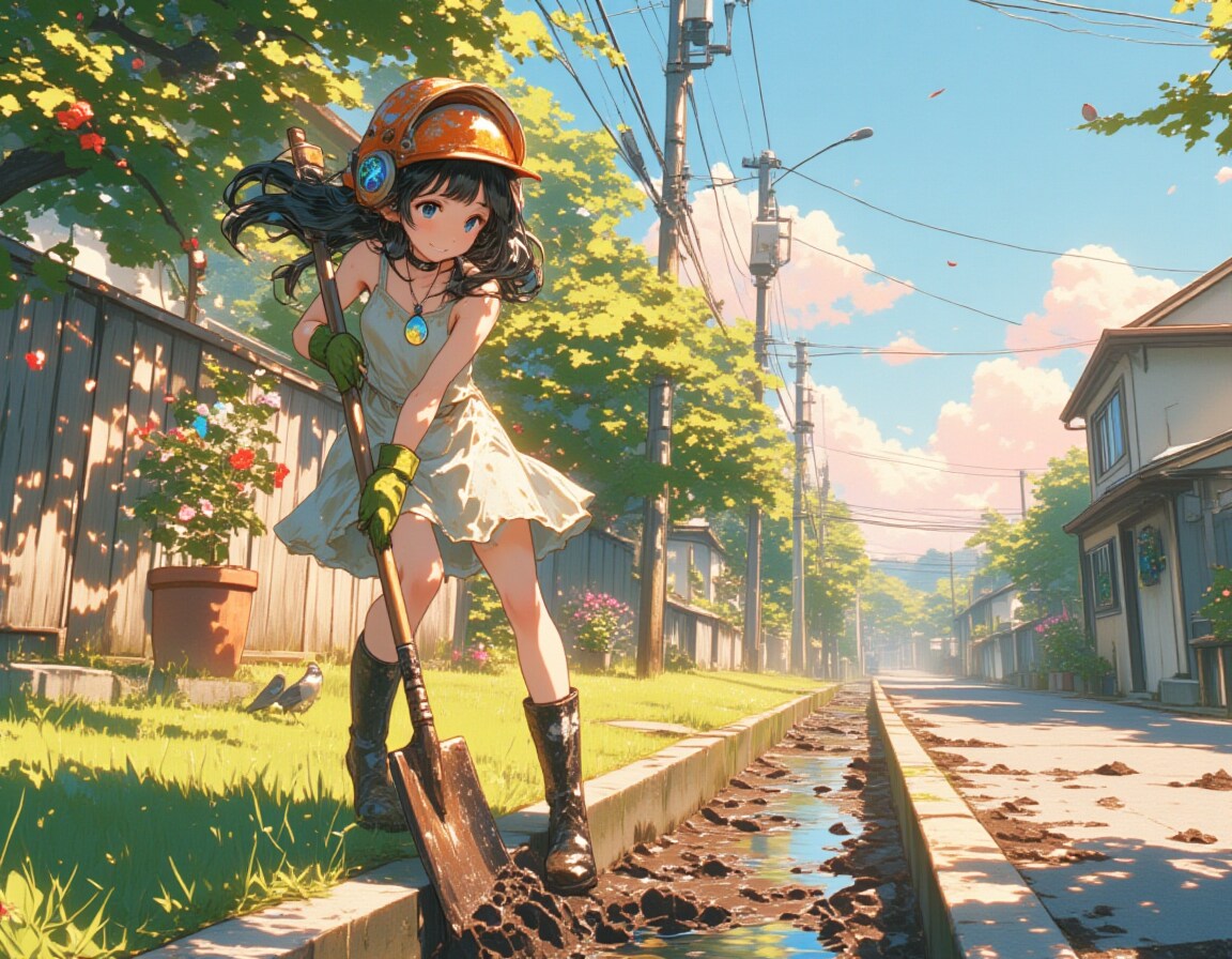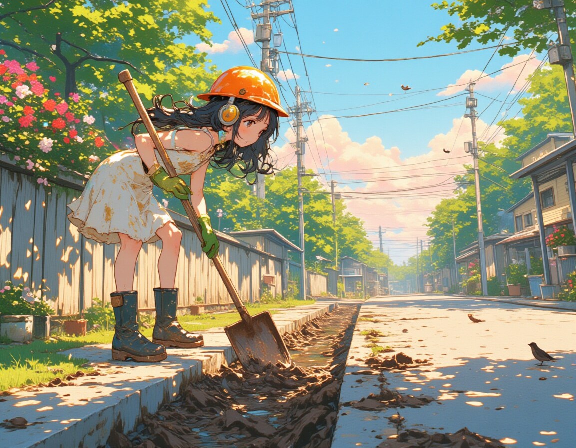 初夏の朝、側溝掃除をする少女