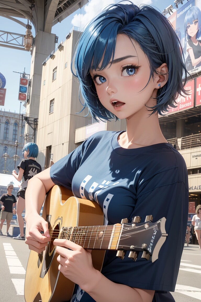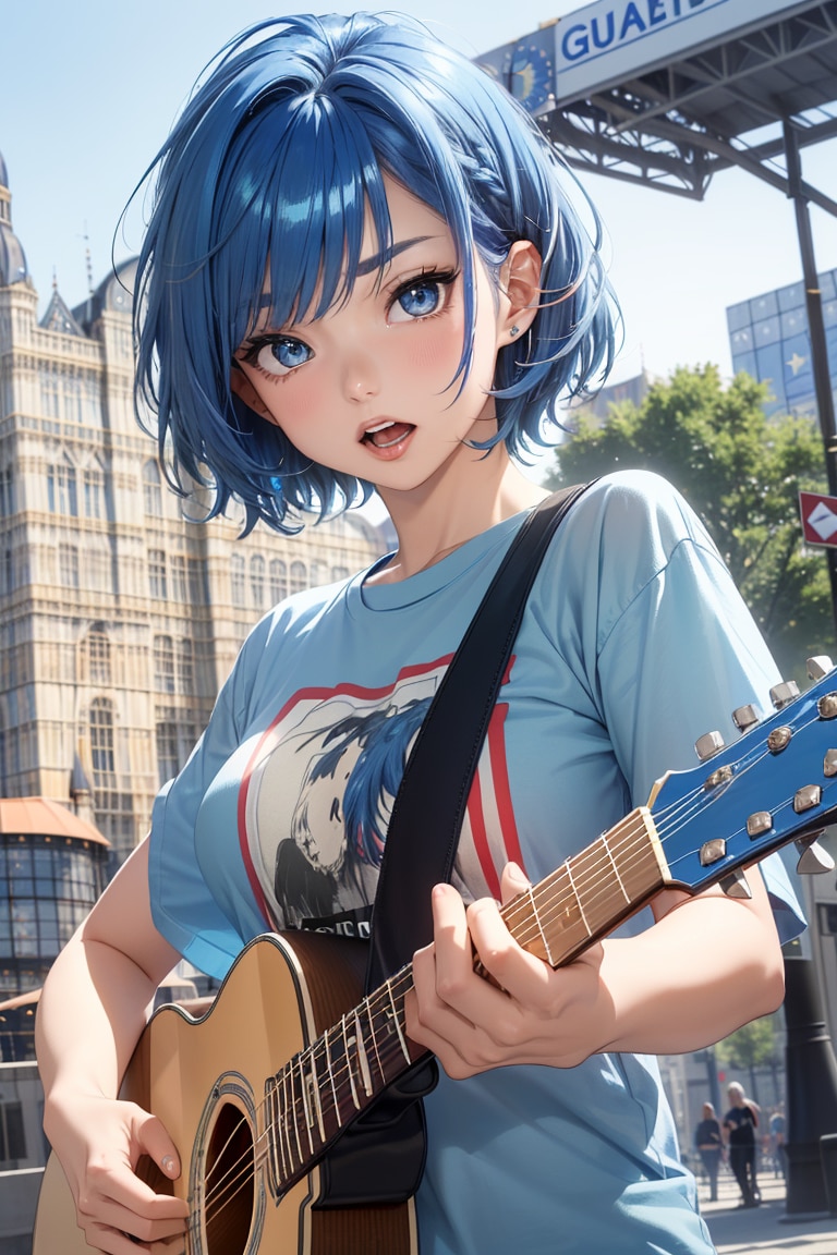 ヨーロッパの駅前広場でTシャツでギター演奏