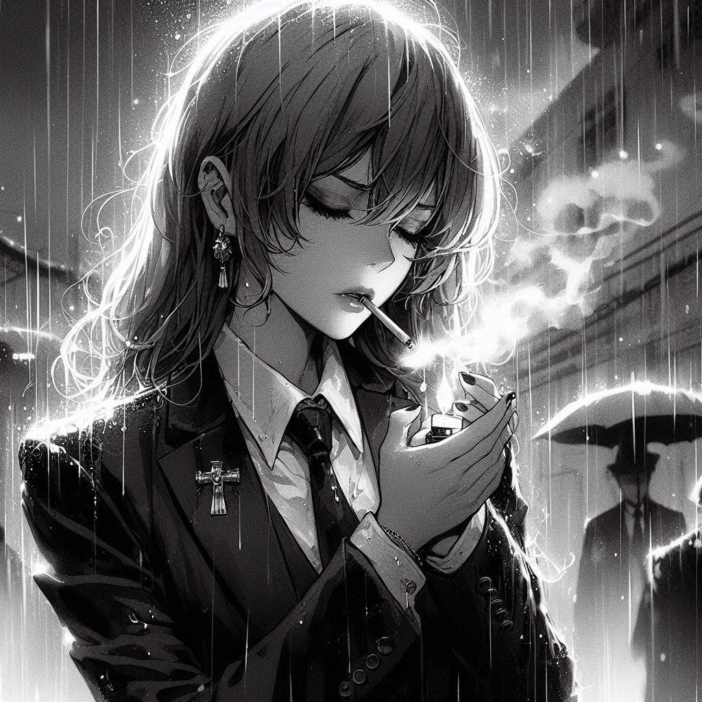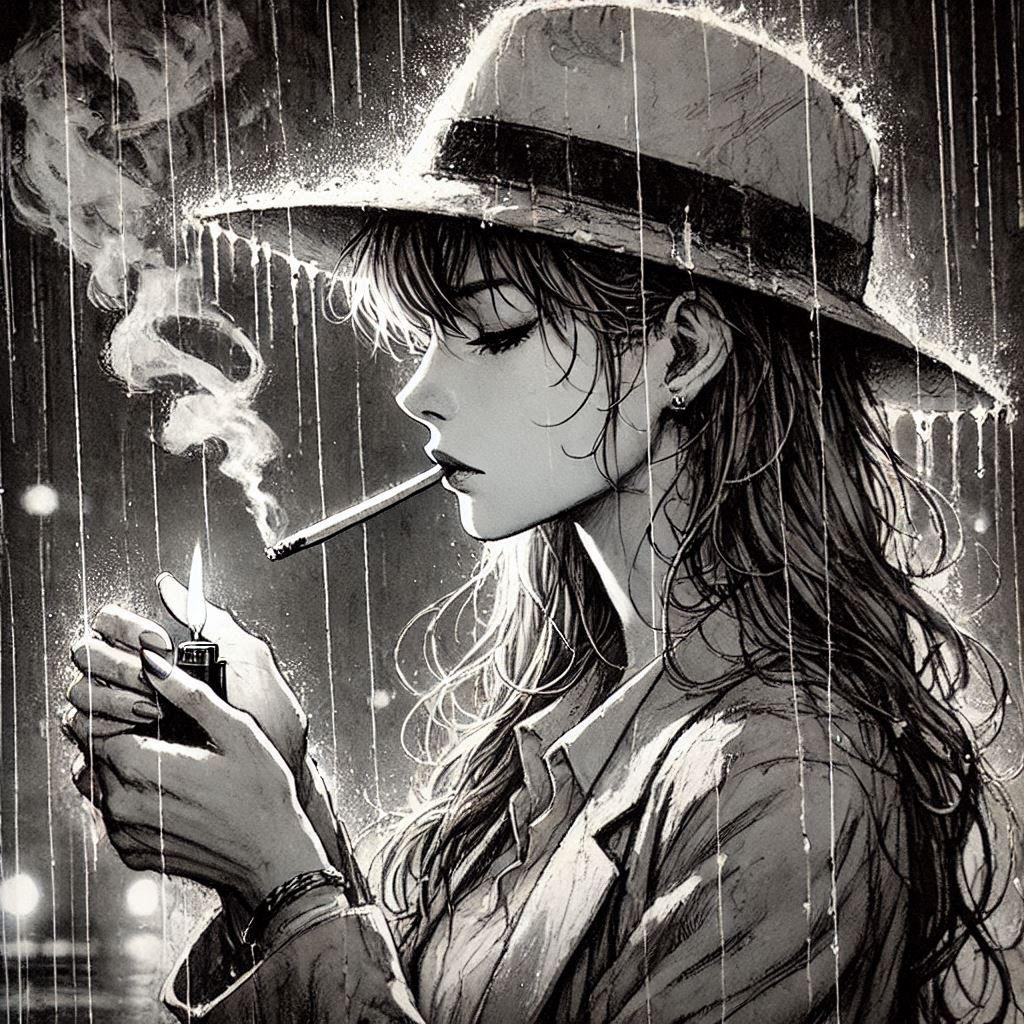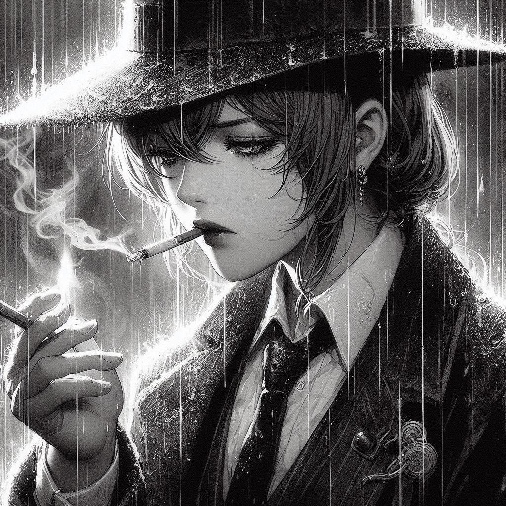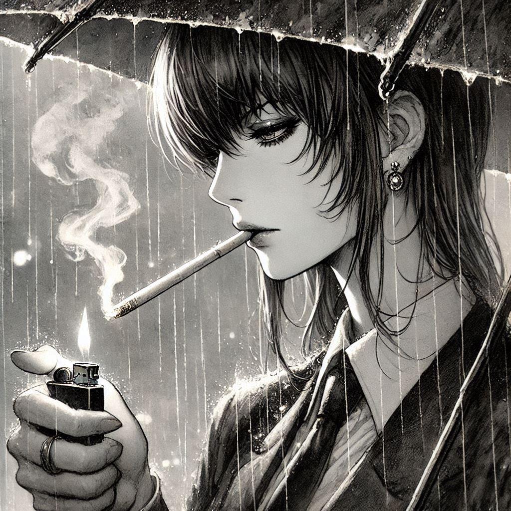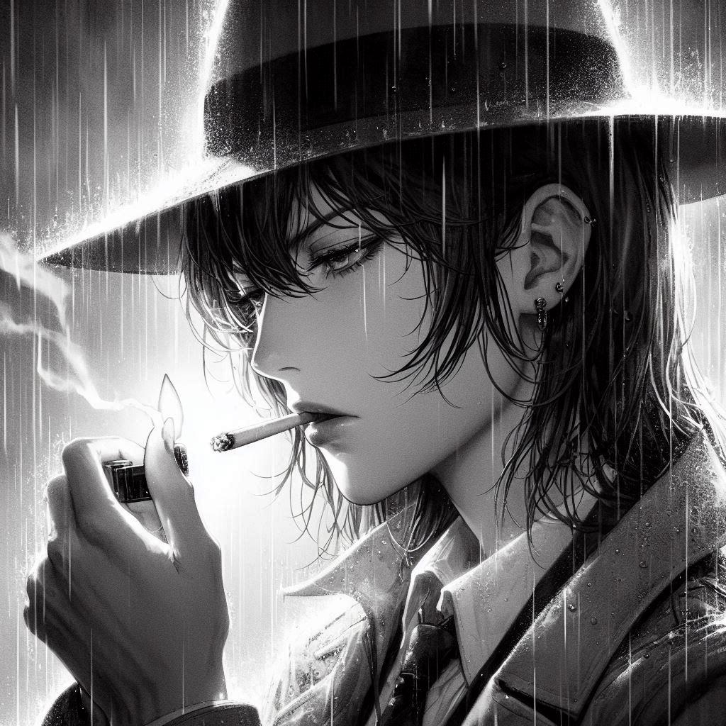 今回はちょっと違う構図にしたくて、悲しい雰囲気の中で煙草に火を点けているマフィアを生成してみました。