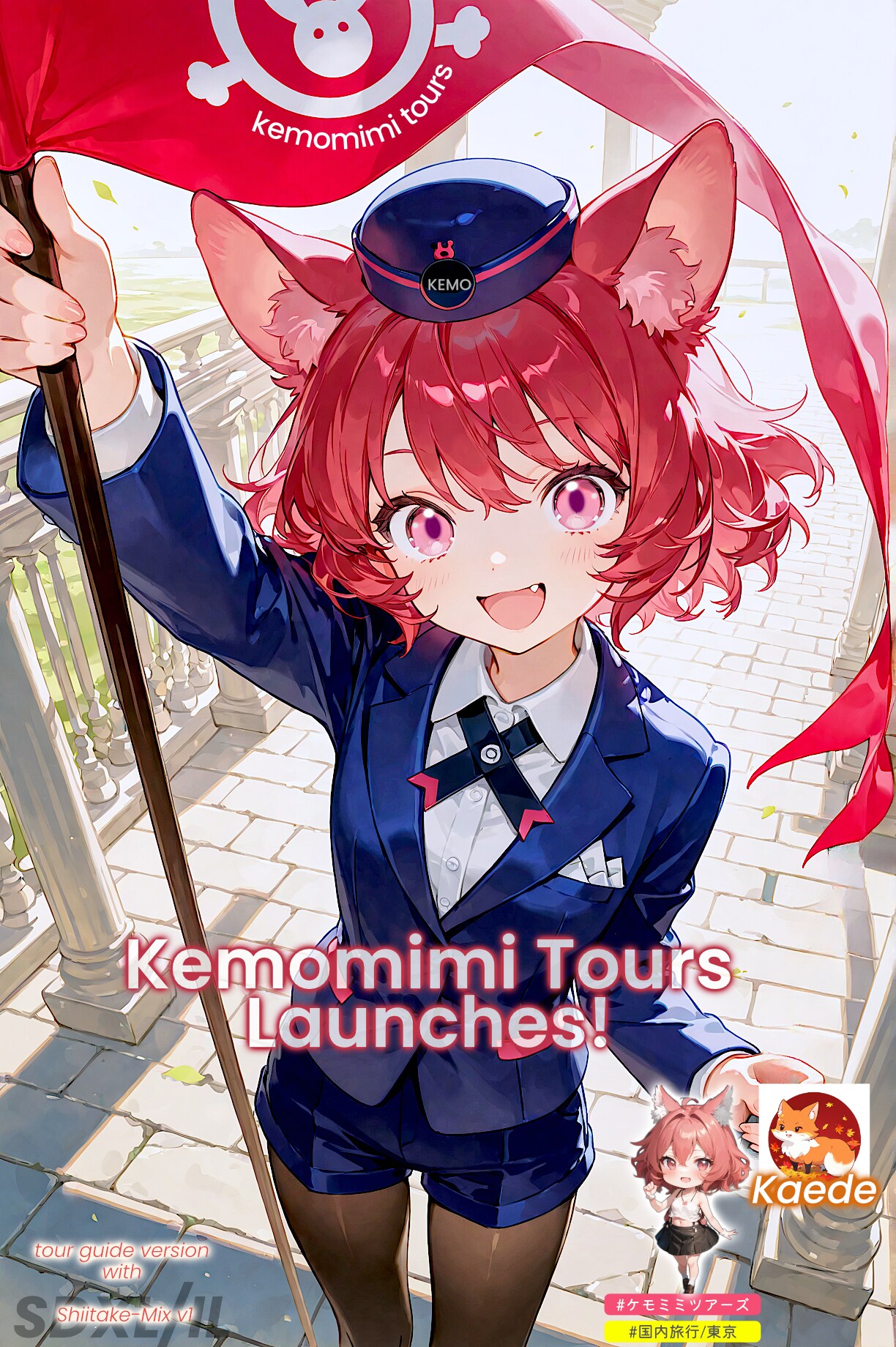 ●#2枚目:けもみみみの旗がちゃんと出た、当初やろうとしていた構図のものです。これは盛大にモフモフ尻尾が出たのでi2iで消して再生成したものです。