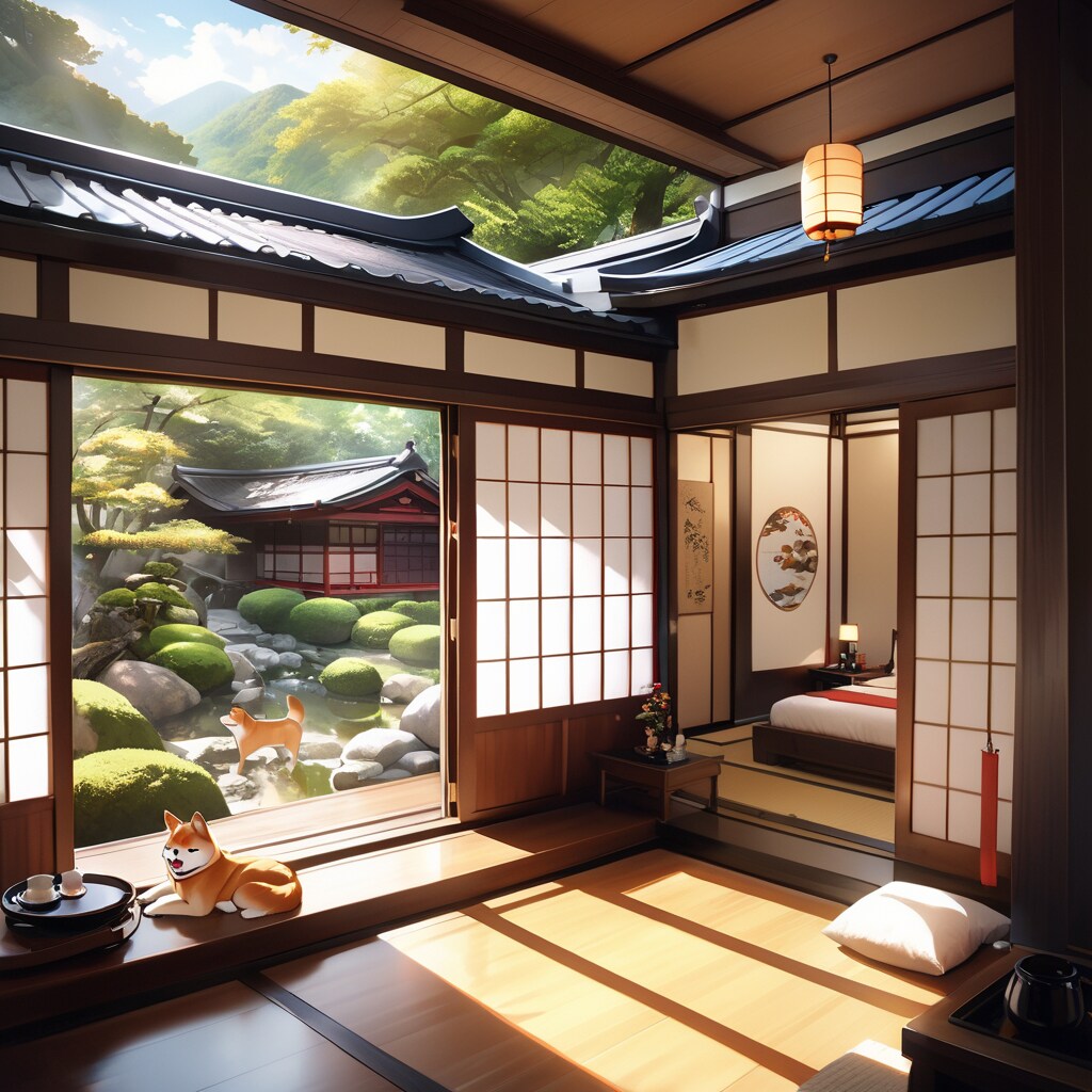 ⑥縁側[柴犬の「わさび」と「さしみ」](風情ある日本庭園をお楽しみください)