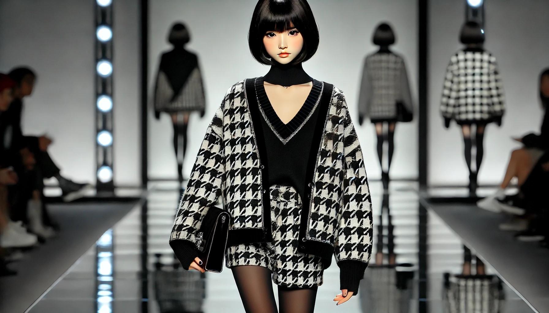 - 柄: 白黒の千鳥格子柄のセットアップ(ジャケット&ショートパンツ)。