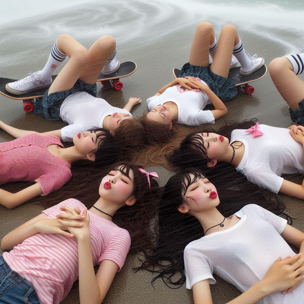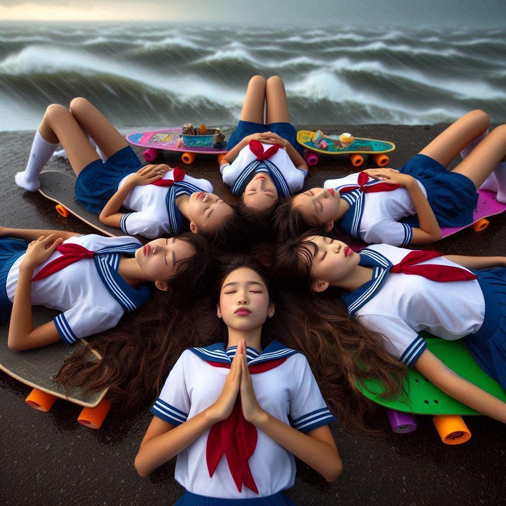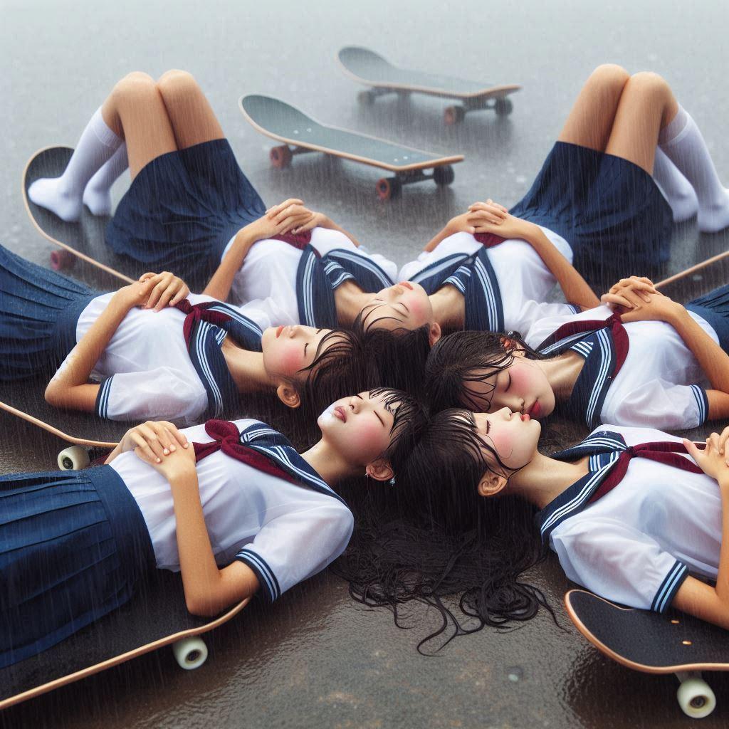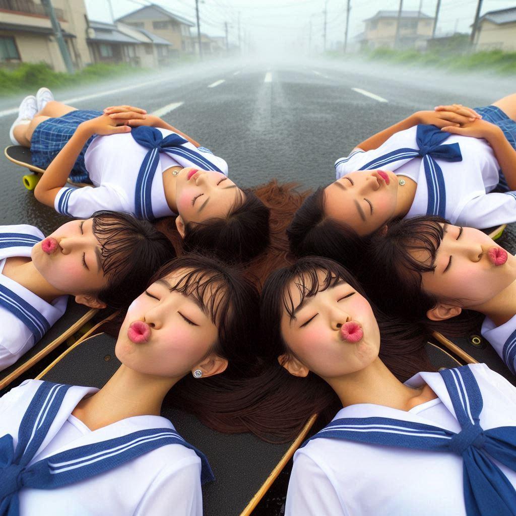 ◯◯人の美人の小中学生女子◯人がスケボーで仰向け寝そべり族(台風の中)(瞑想中のキス顔