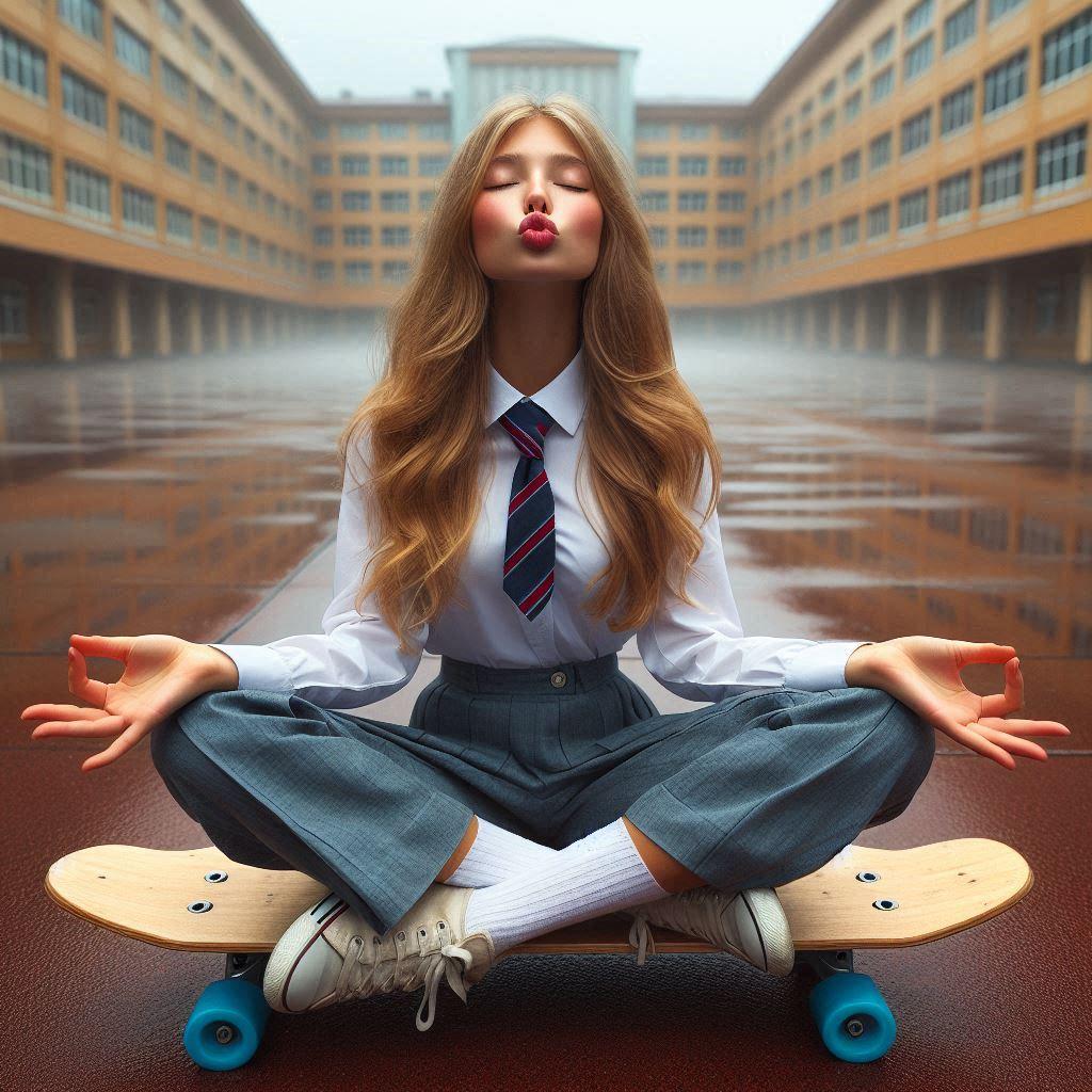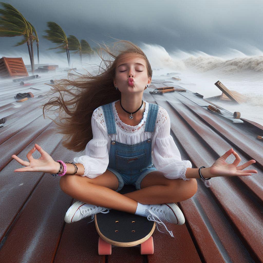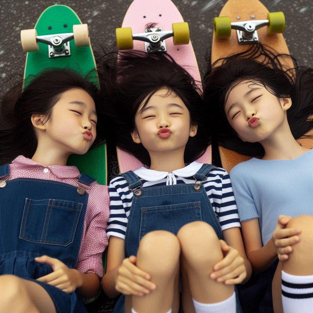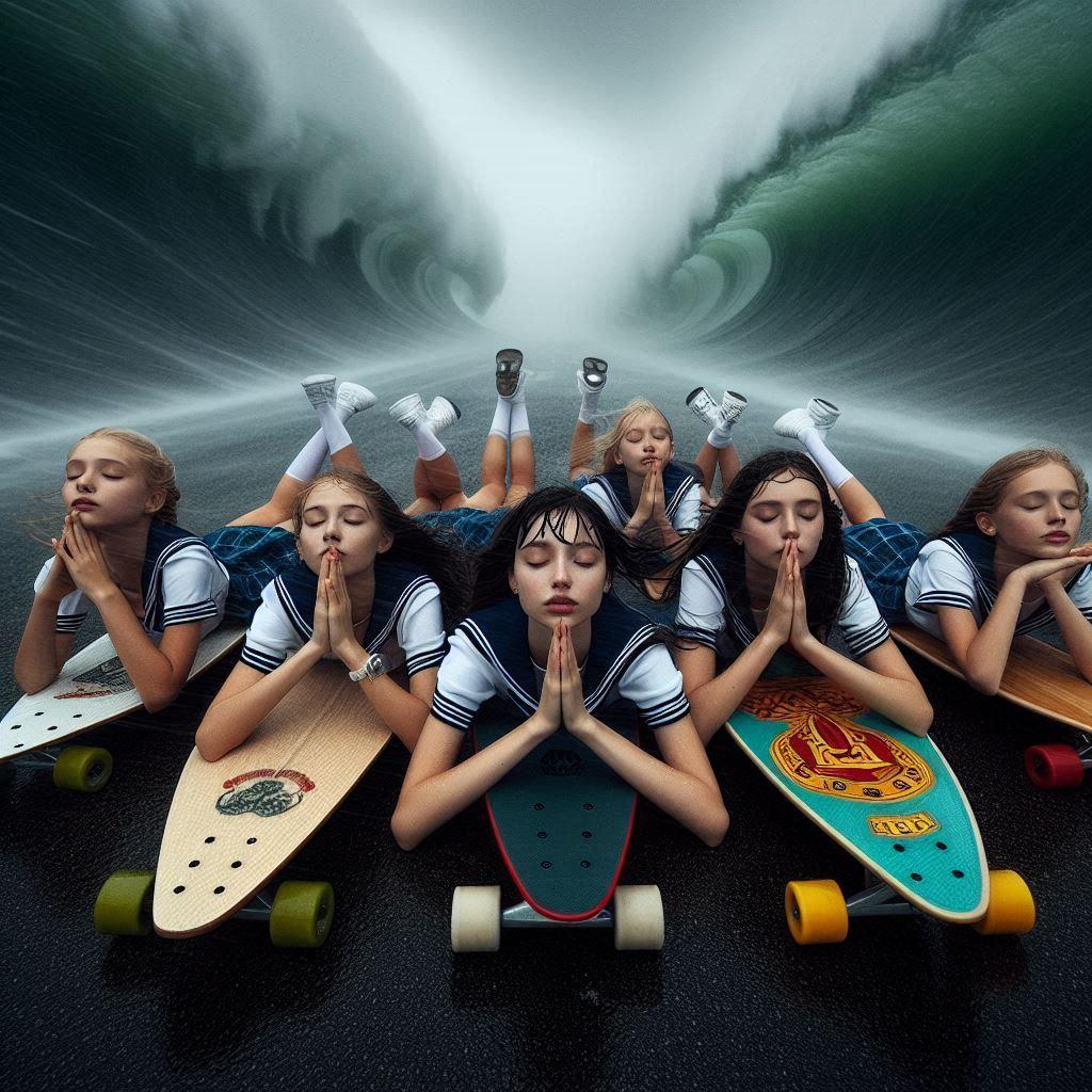 ◯◯人の美人の小中学生女子◯人がスケボーで仰向け寝そべり族(台風の中)(瞑想中のキス顔