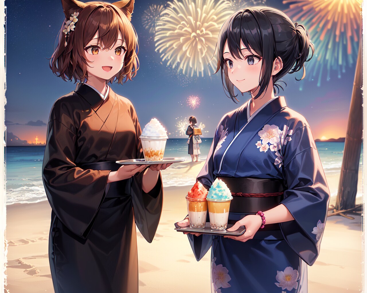 海の花火大会で見物客に浴衣姿でかき氷配達中の猫娘と手伝う僧侶
