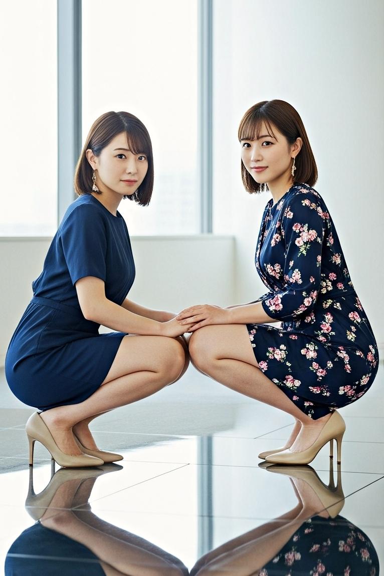 社内で圧倒的な存在感を放つ、ギャル系OLのツートップを紹介します。派手な髪色やネイル、そして大胆なファッションセンスで、誰よりも目立ちながらも、仕事はきっちりこなす最強コンビ。今回は、そんな彼女たちがピンヒールパンプスを履いたまましゃがんでいる瞬間をとらえました。脚線美やパンプスのディテールにもご注目ください。