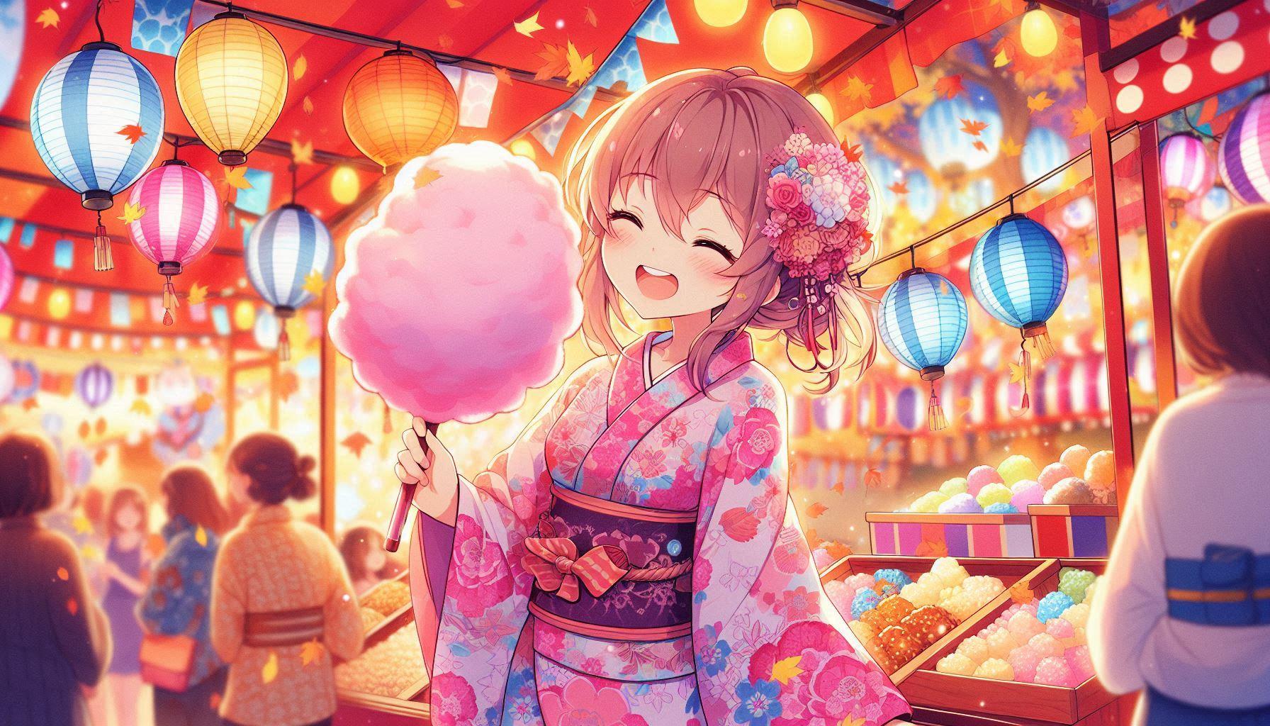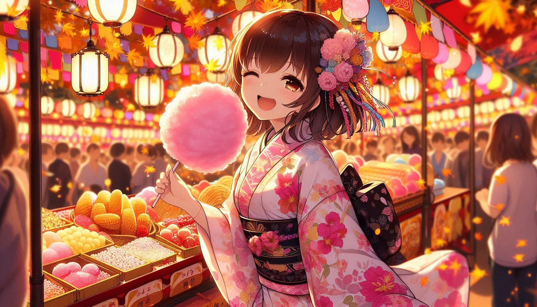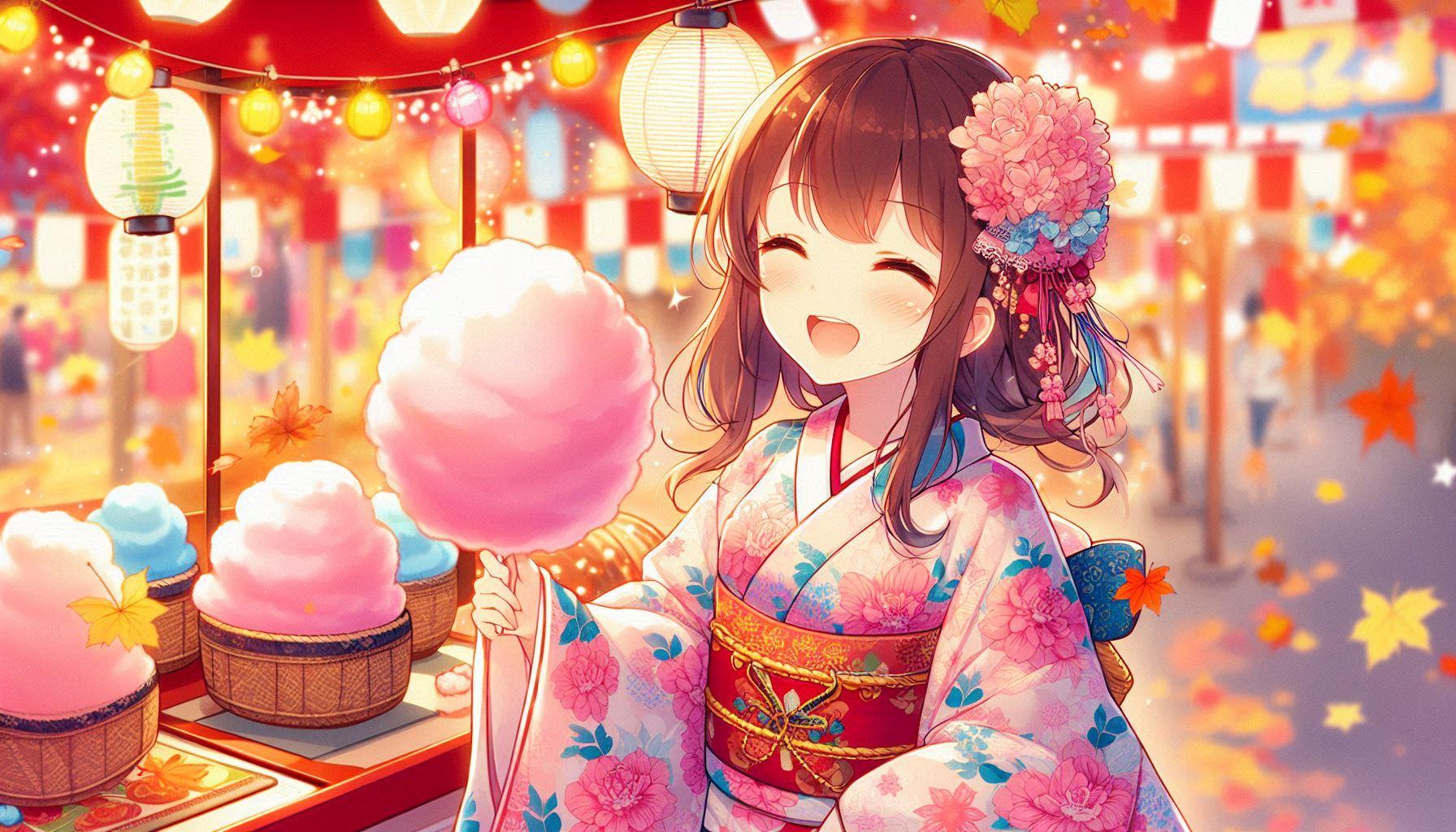 『秋祭の屋台で綿飴を食べている浴衣の女の子。』