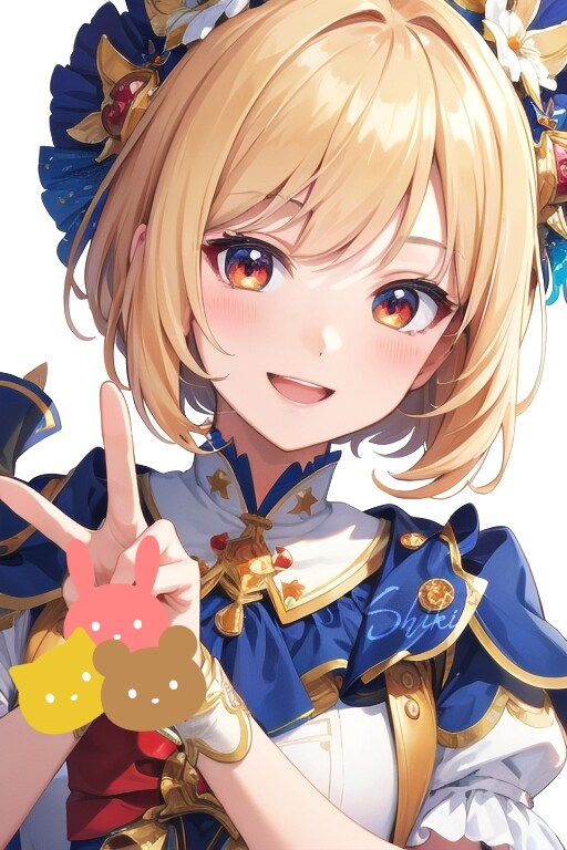 シンプルな呪文にidol、happyと入れたら、凝った素敵衣装の少女たちが生成されました。