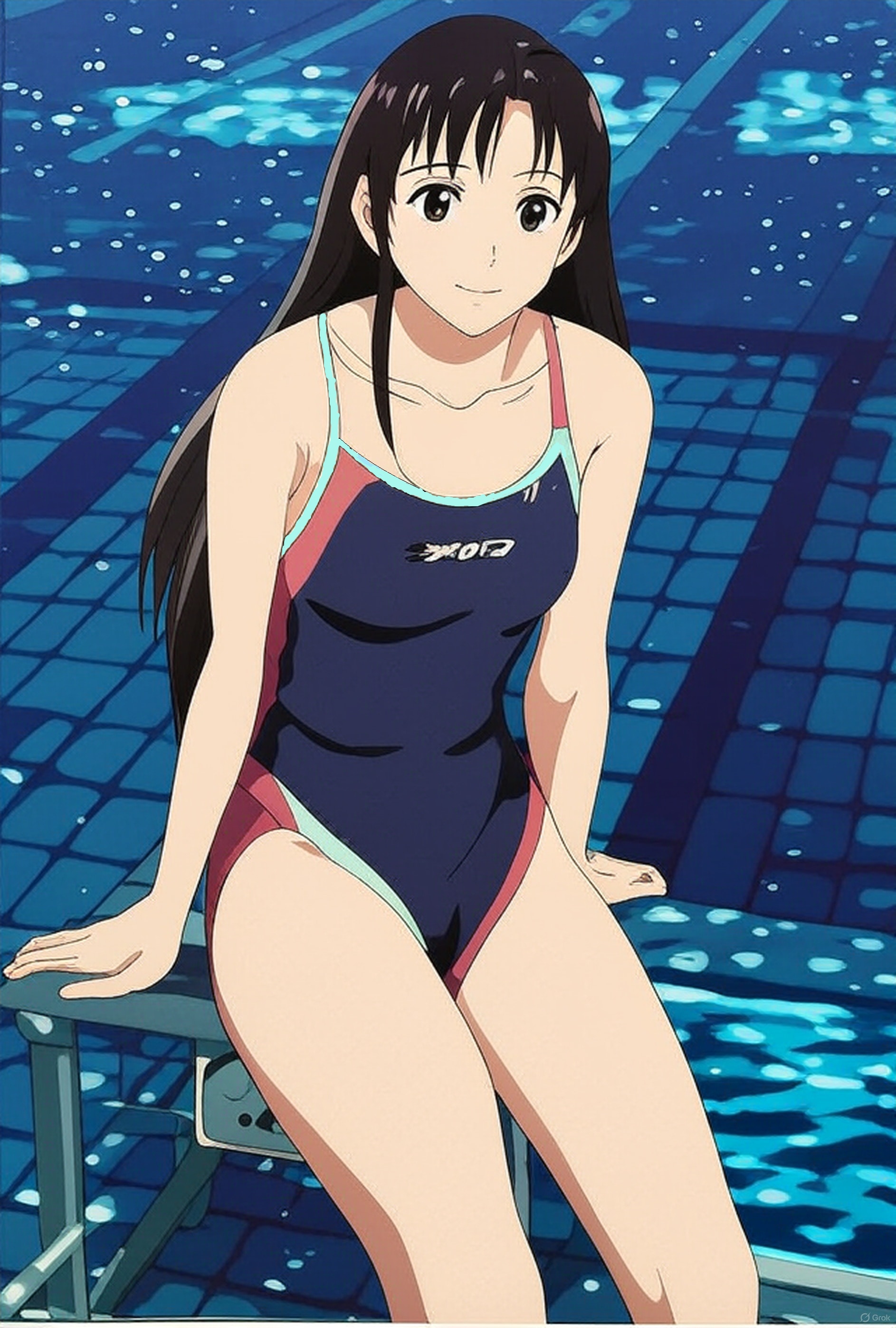 スタート台に腰掛けるロングヘアーの競泳水着少女