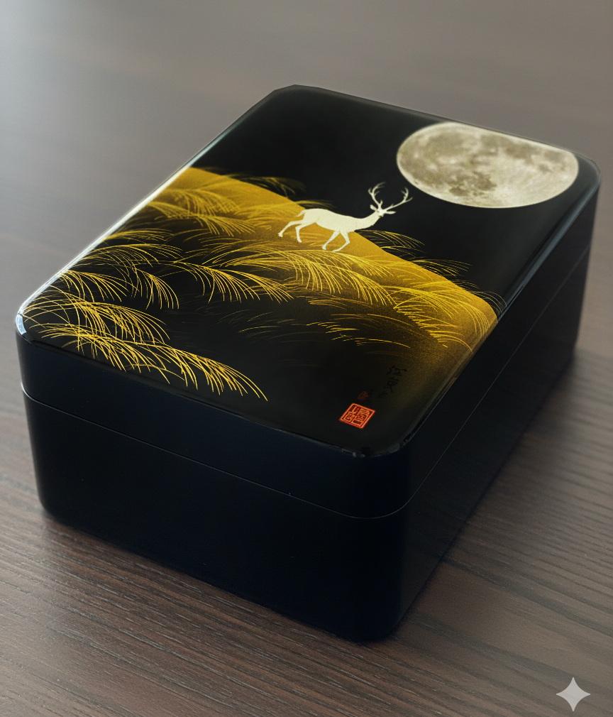 2枚目は1枚目をもとに Nano banana で漆塗りに金蒔絵の文箱にしてもらいました