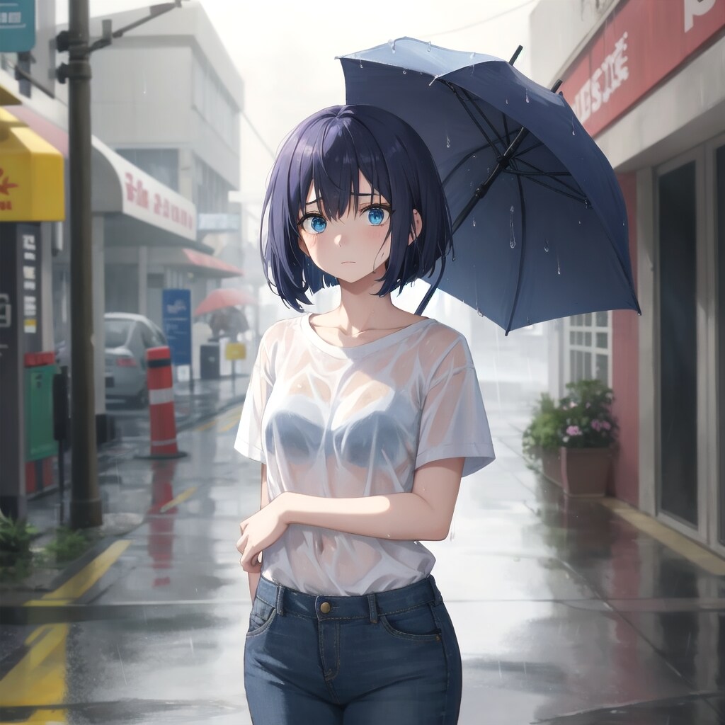 傘を忘れてしまい、突然の雨に打たれながら困った顔で立ち尽くすボブ子ちゃん。白いシャツとジーンズが濡れて体に張りつく。