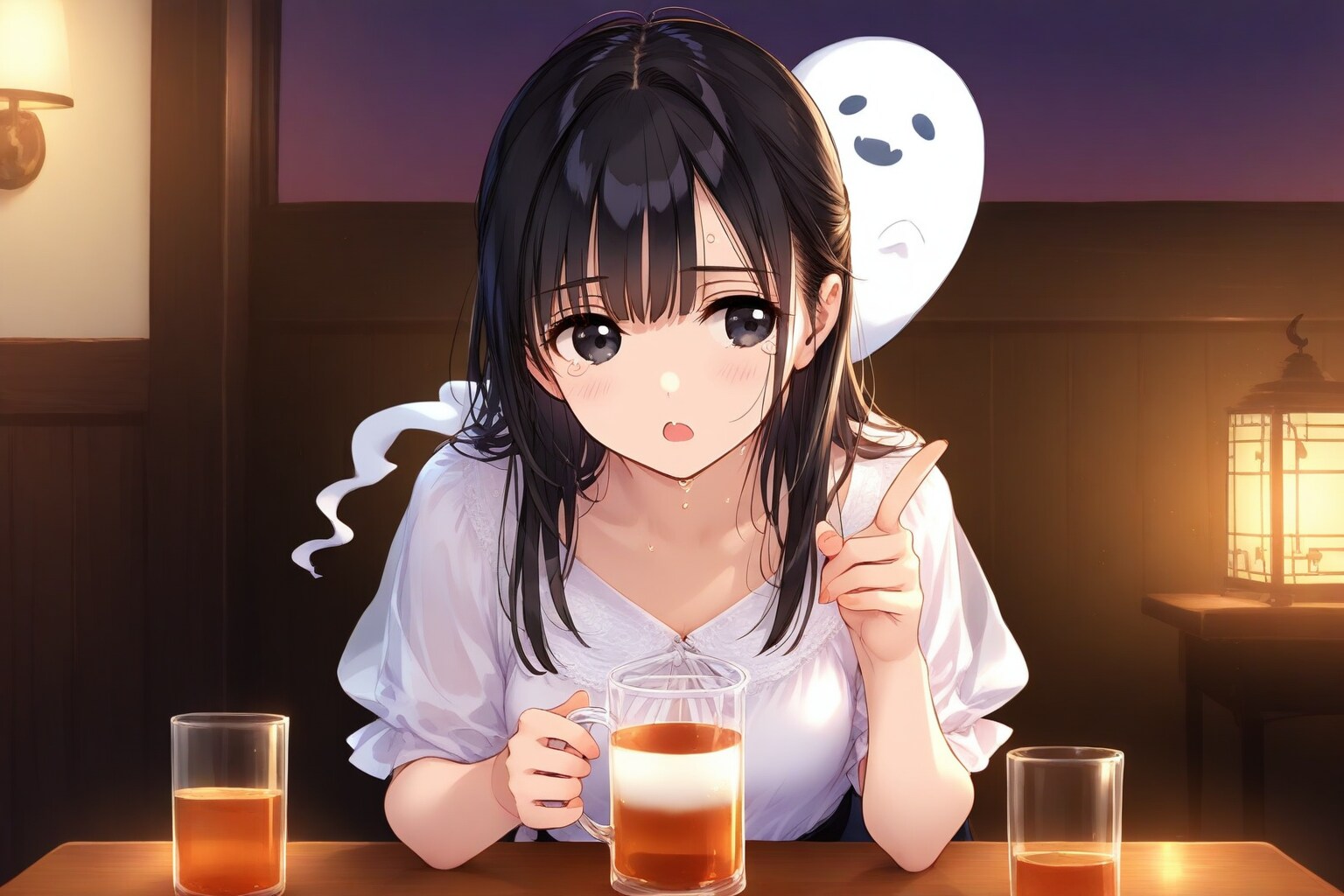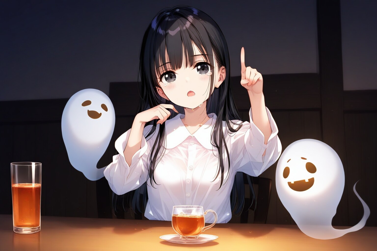 本当はお化けを泣かせるはずが、なぜか女の子の方が泣いてる。それと構図の指定も正面から向かい合う