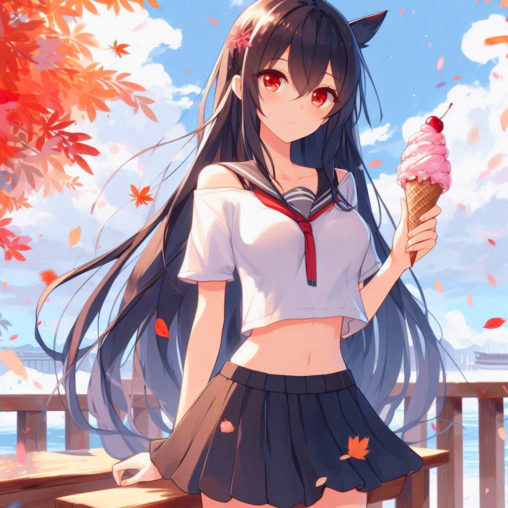 アイスクリームと、猫耳な黒髪ロング少女*(2枚)
