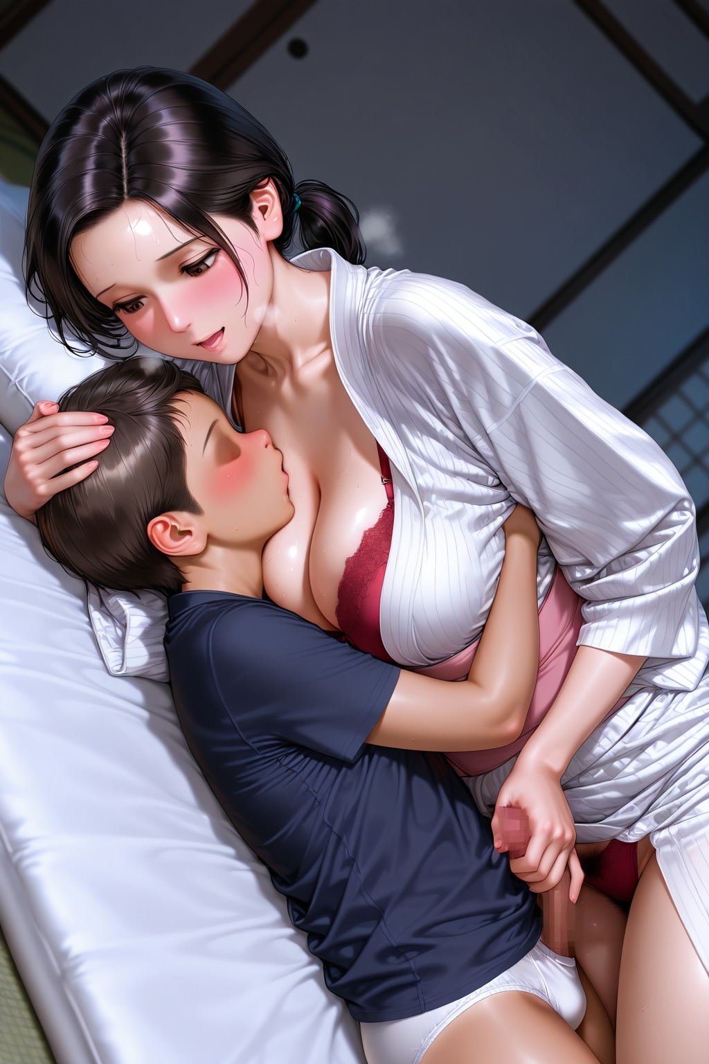 綺麗な浴衣に身を包んだ先生は、男の子を布団へ招き入れる