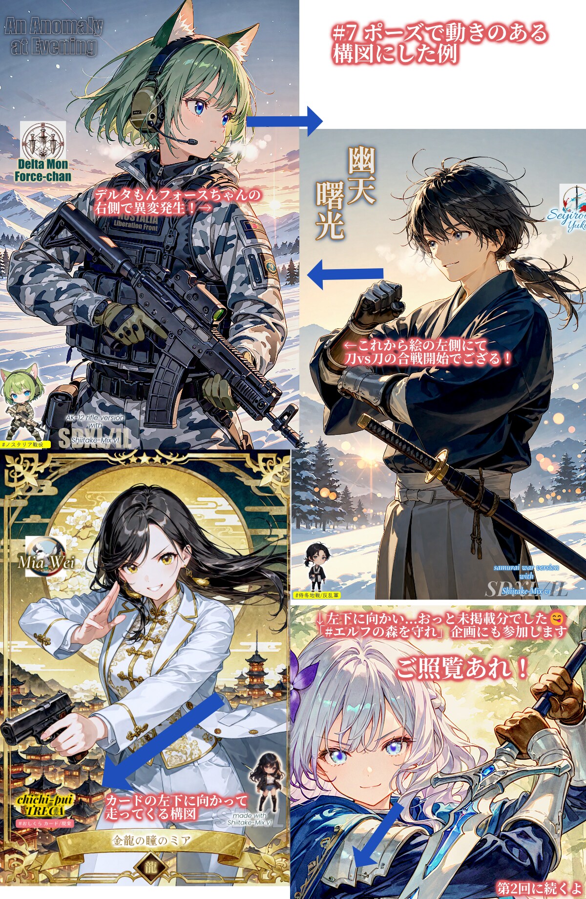 【左上】猫乃つづりさんの「#ノスタリア戦役」に献上したもの。雪に包まれたノスタリア共和国、AKアサルトライフルを携えたこのキャラのデルタもんフォースちゃんの読者から見て右側の方で異変が発生! これからきっと絵の右側に向かって走っていきます。