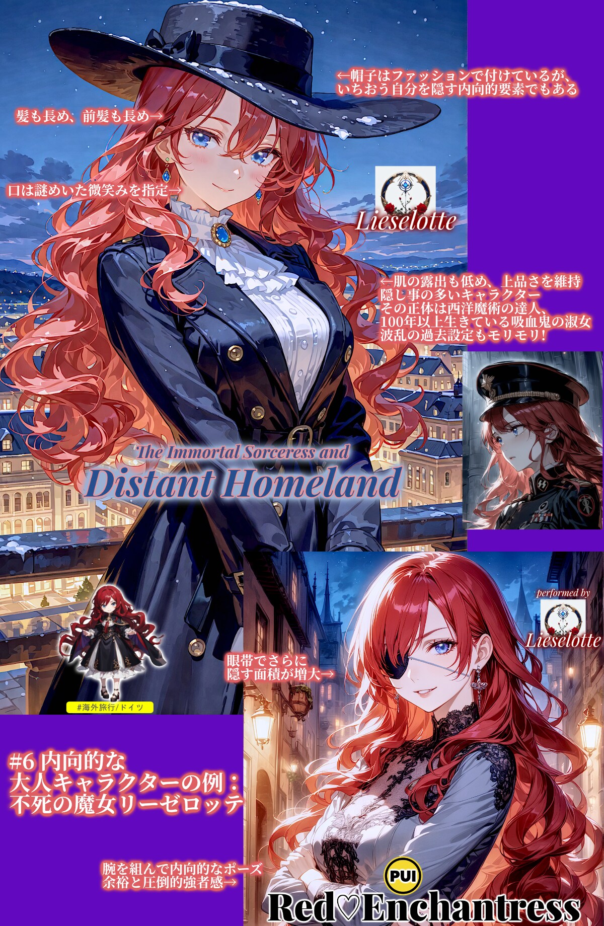 拙作のキャラの多くに共通するのですが、彼女も肌の露出度は控え目にして上品さを維持し、隠し事が多い謎めいた内向的なキャラクターとしています。その正体は設定モリモリの吸血鬼、過去の重みがあるからこその強さを持たせたキャラクターです。