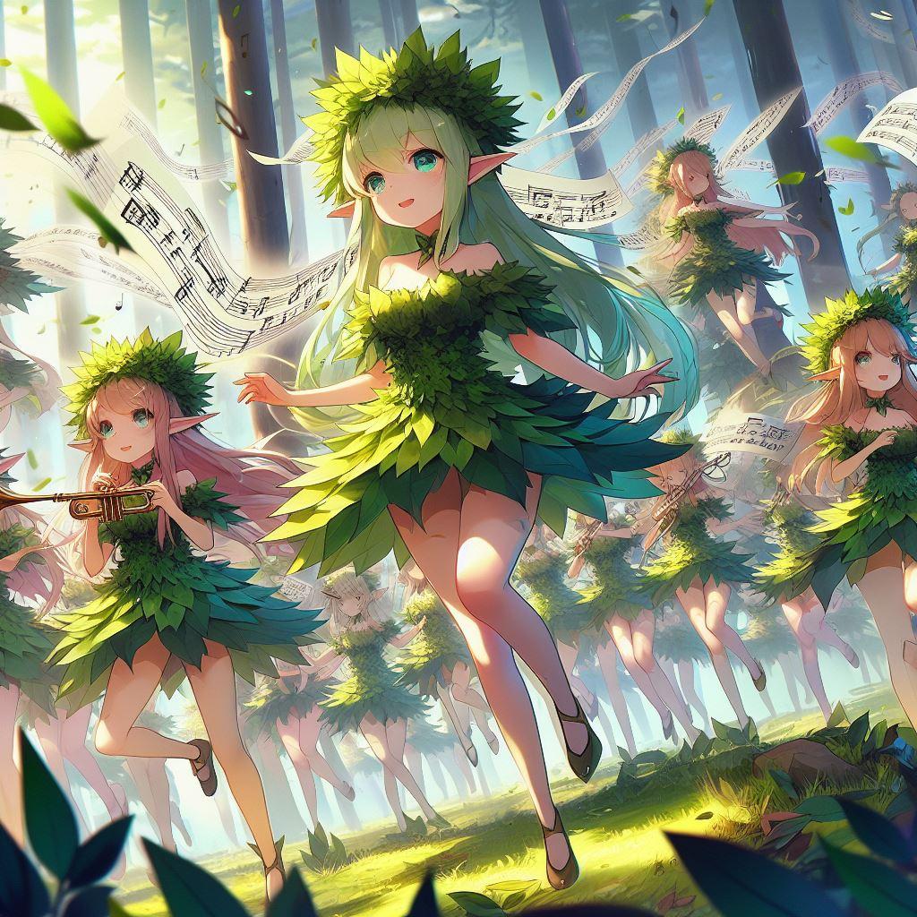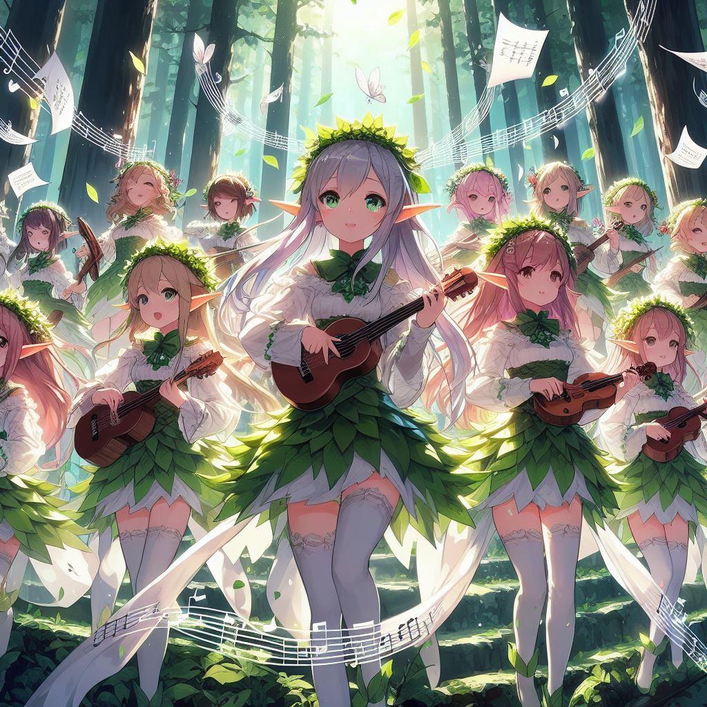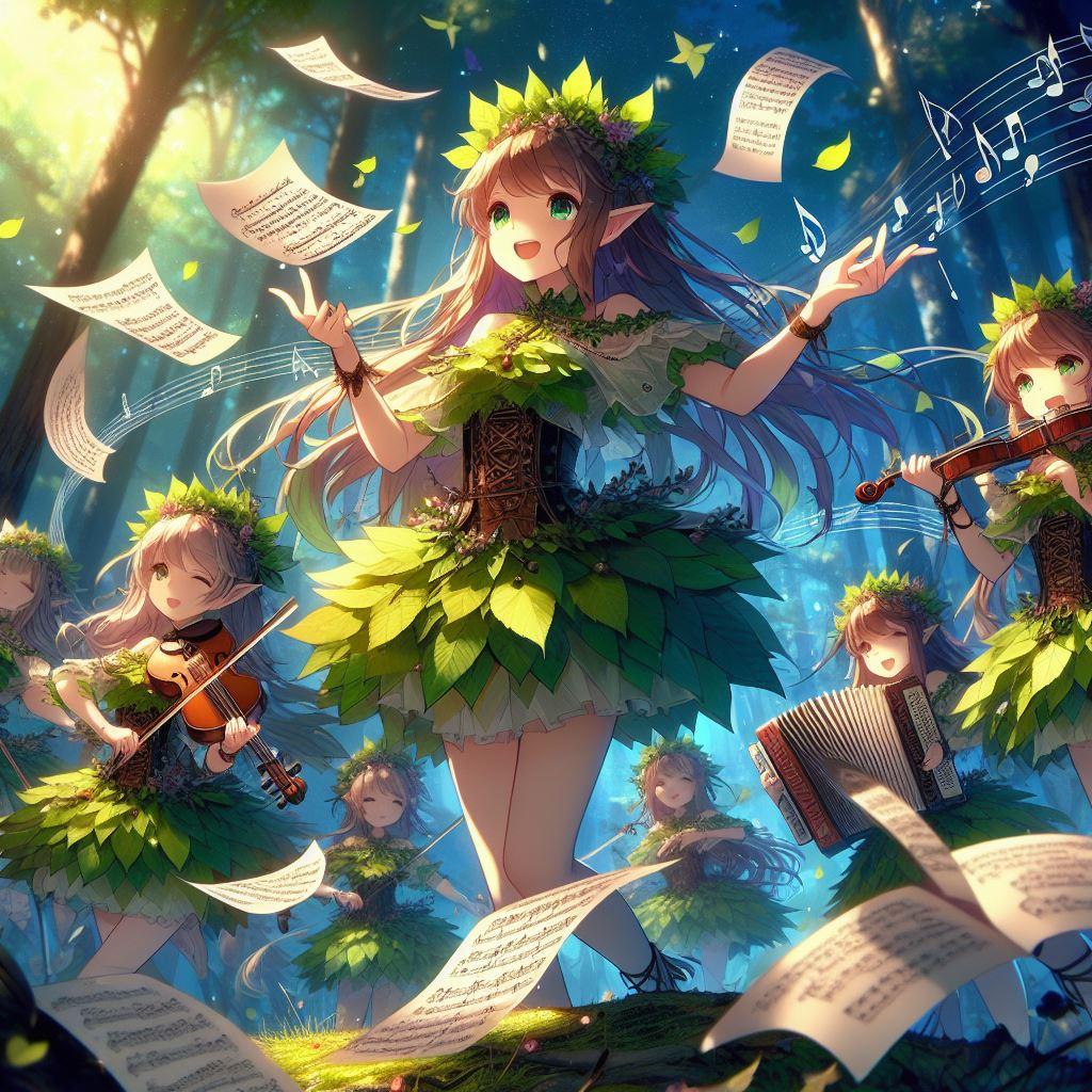 エルフはみな若葉の衣装を着て魔法の楽器を弾き、魔力のこもった歌を歌い踊ります