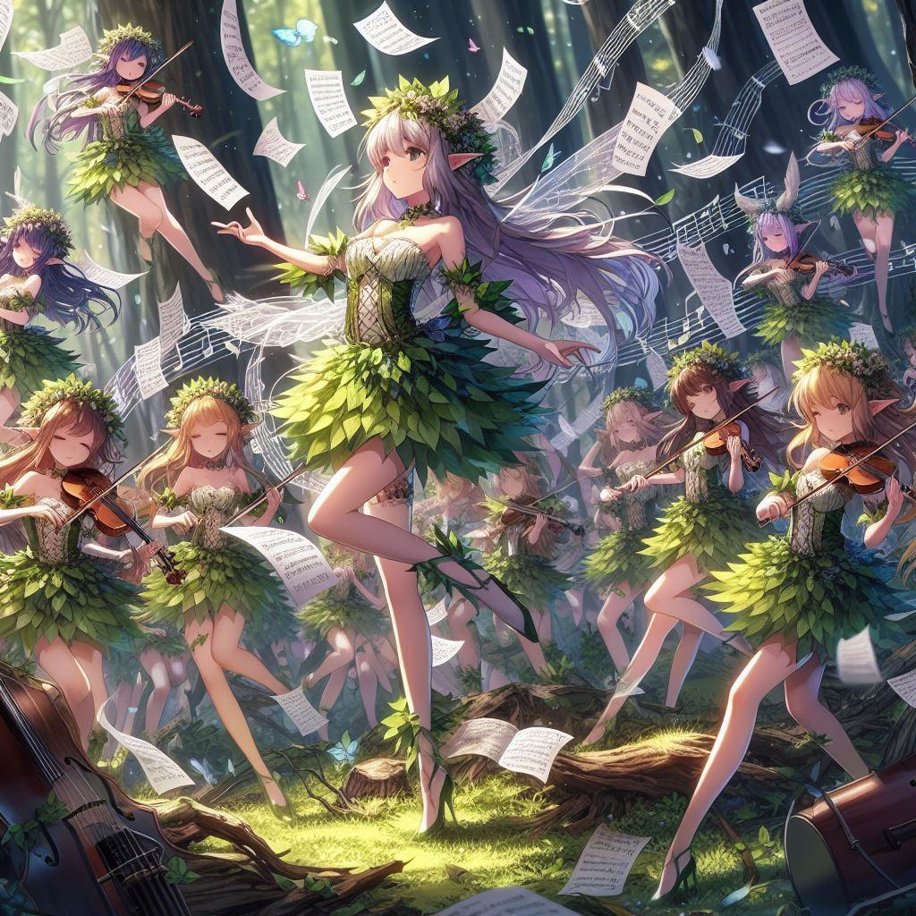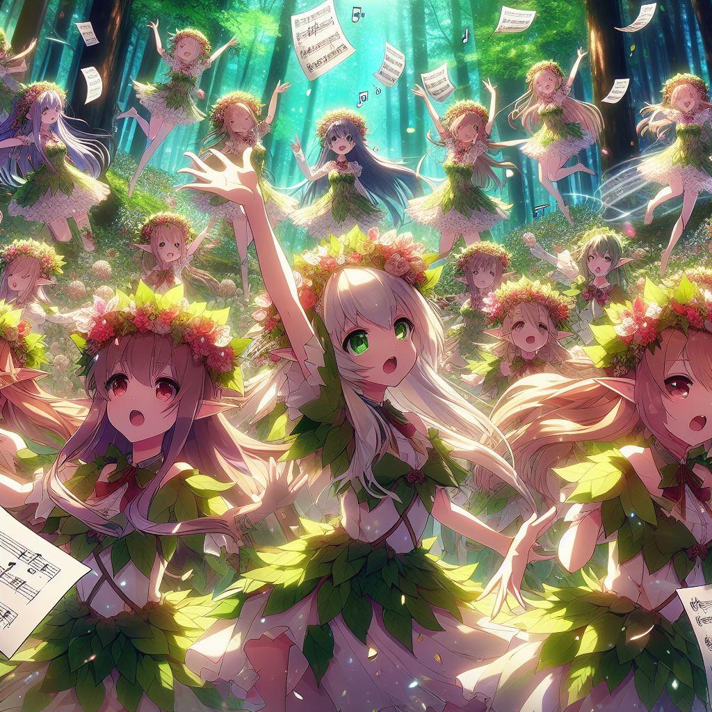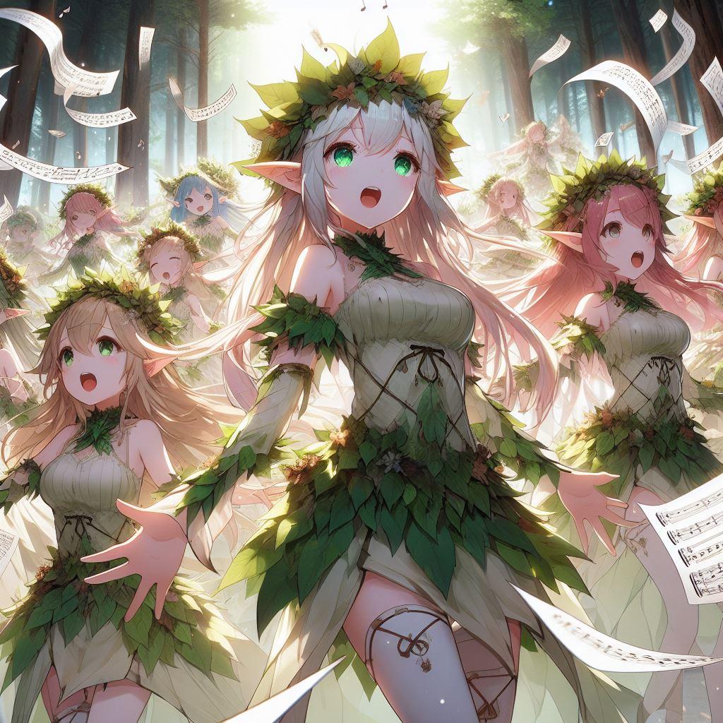 エルフはみな若葉の衣装を着て魔法の楽器を弾き、魔力のこもった歌を歌い踊ります