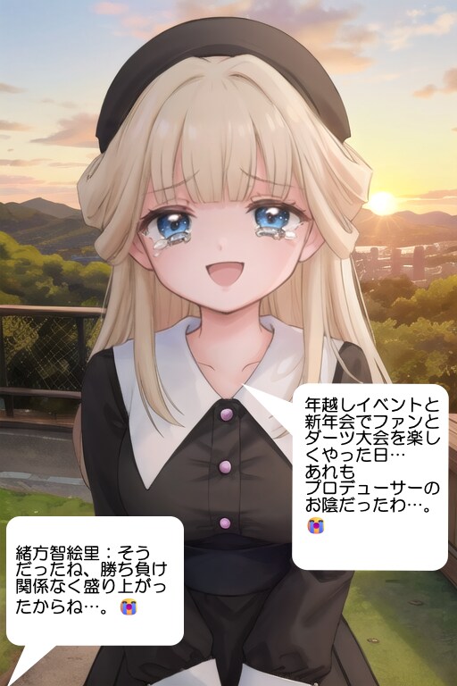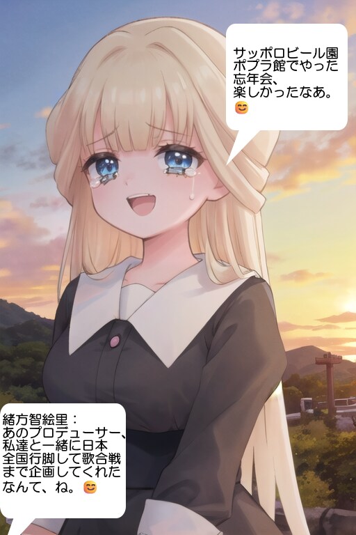 緒方智絵里:あのプロデューサー、私達と一緒に日本全国行脚して歌合戦まで企画してくれたなんて、ね。😊
