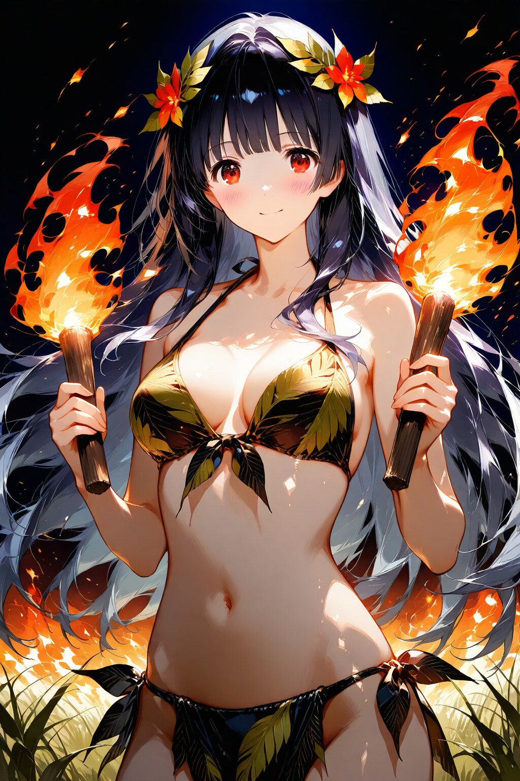 佐々木花音(静かに): 「皆さん、見てください。私の挑戦を…。」 [彼女は慎重にトーチを操り、優雅かつ力強い動きで炎を舞わせる。時折緊張が見えるが、静かな集中力でパフォーマンスを完成させる。観客から拍手が沸き起こる。]