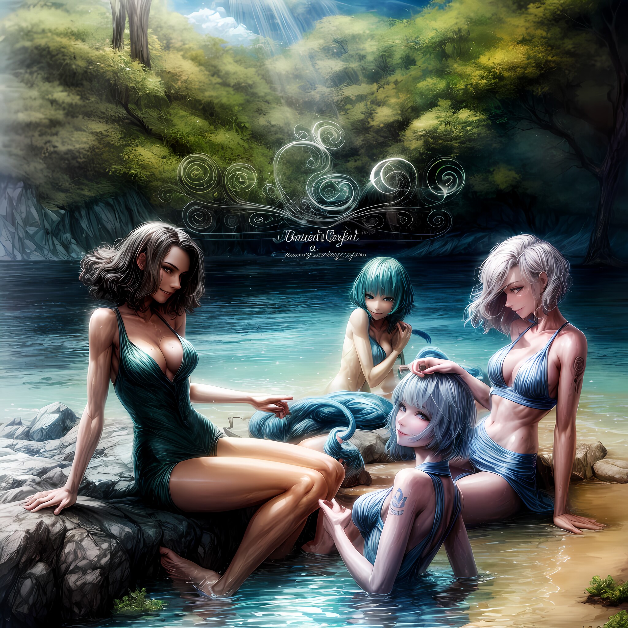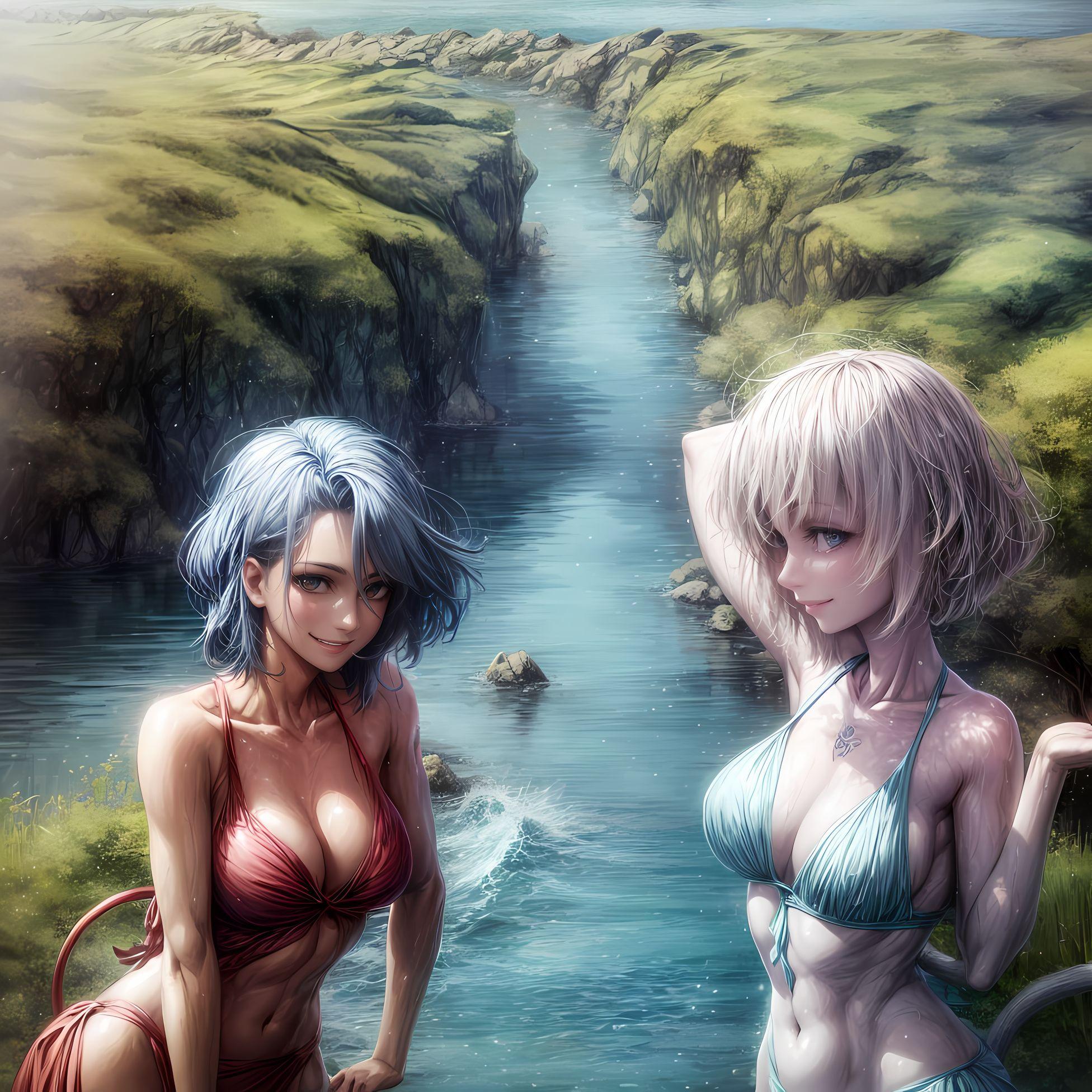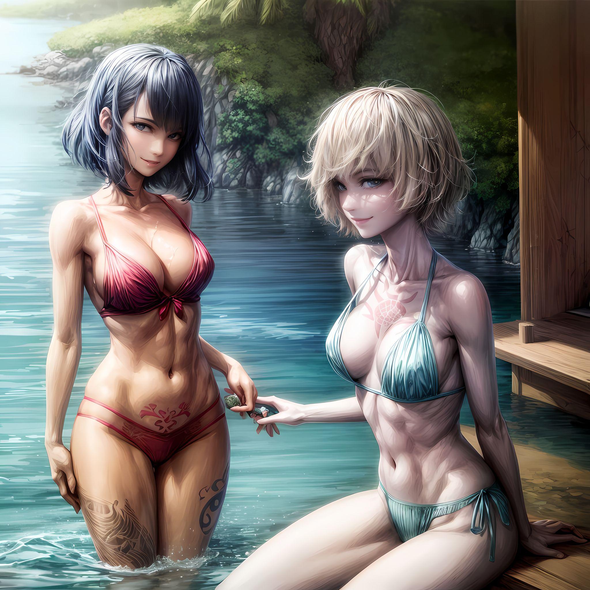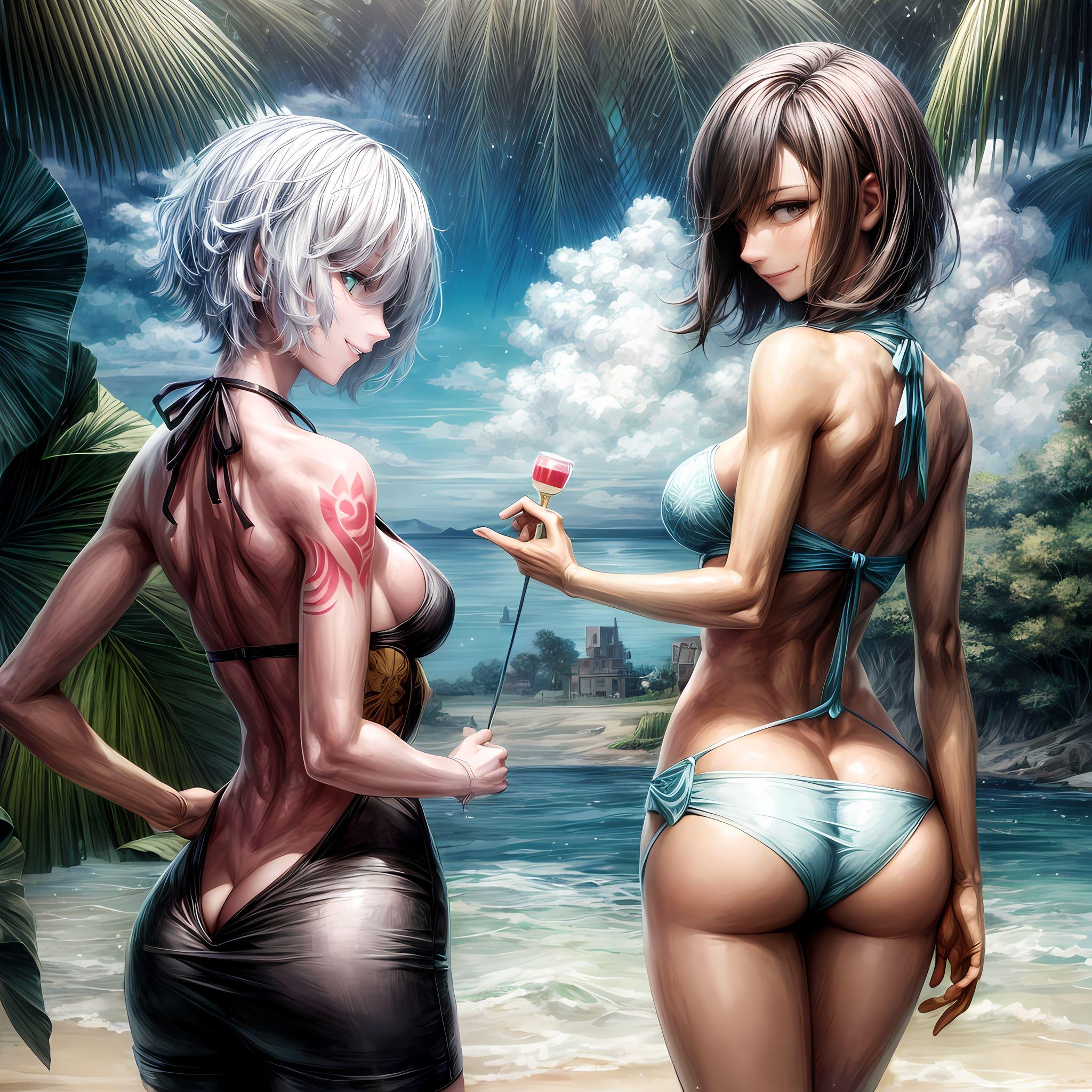 幻的な世界で煌めく「神秘的な女性たち」がプライベートビーチで夏休みを満喫する幻想的なAIイラストをお届けします。彼女たちの小悪魔スマイルと美しいビキニ姿が、夏の日差しを華やかに彩ります。ファンタジーの世界観と幻想的な城の背景が、あなたを異国の夢へと誘います。