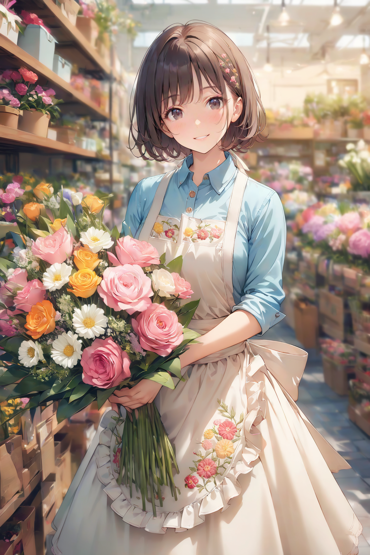 お花の刺繍入りエプロンを着けた花屋のおねいさんです。