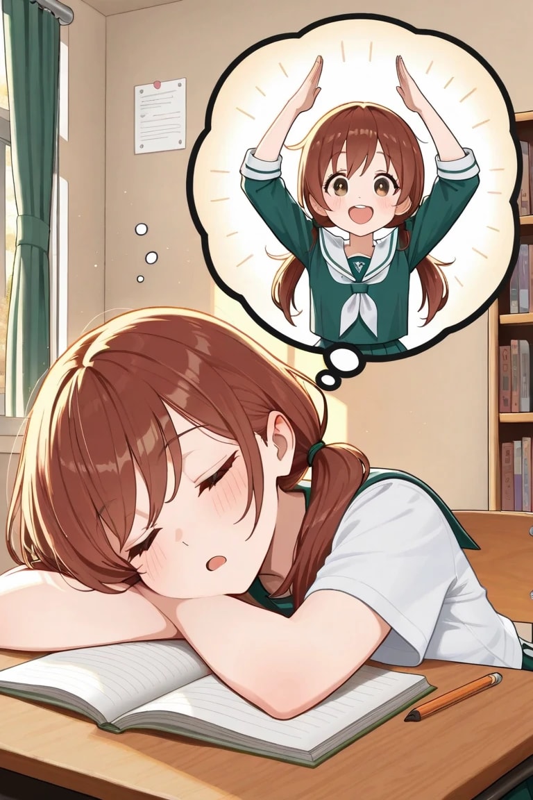 白紙の宿題の上で素敵な夢を見る8月31日の絵海ちゃん。現実は時に非情である。