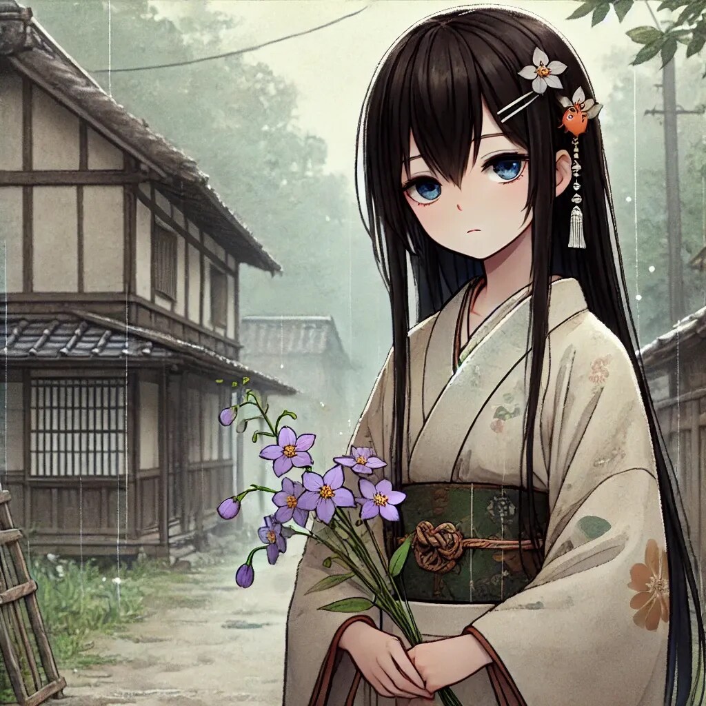 質素な着物と、ジト目で青い瞳が印象的ですね。🌿☔