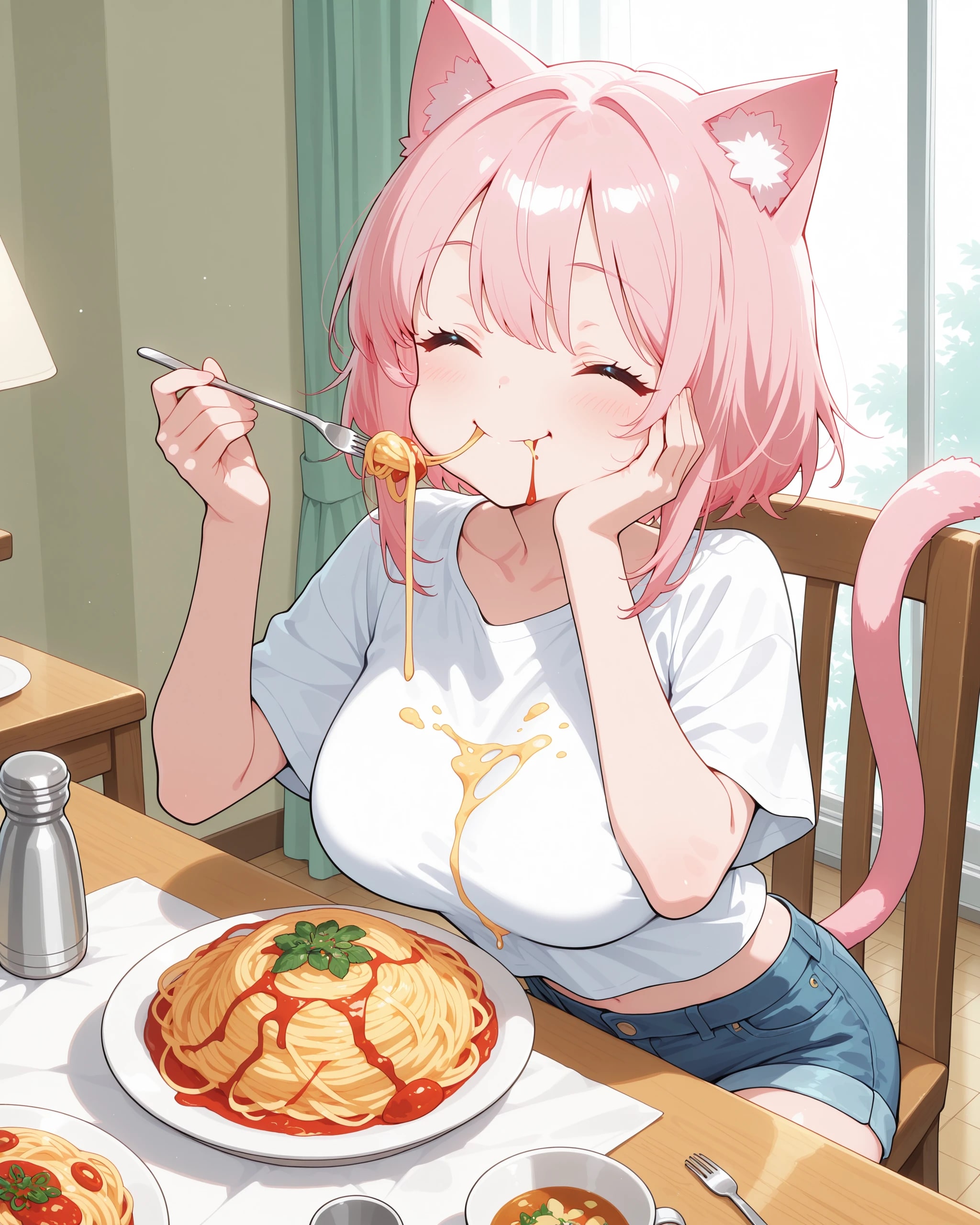 smile, happy, と eating pasta, holding fork, elbow on table, hand on own cheek, の相性が思いのほか良かった!
