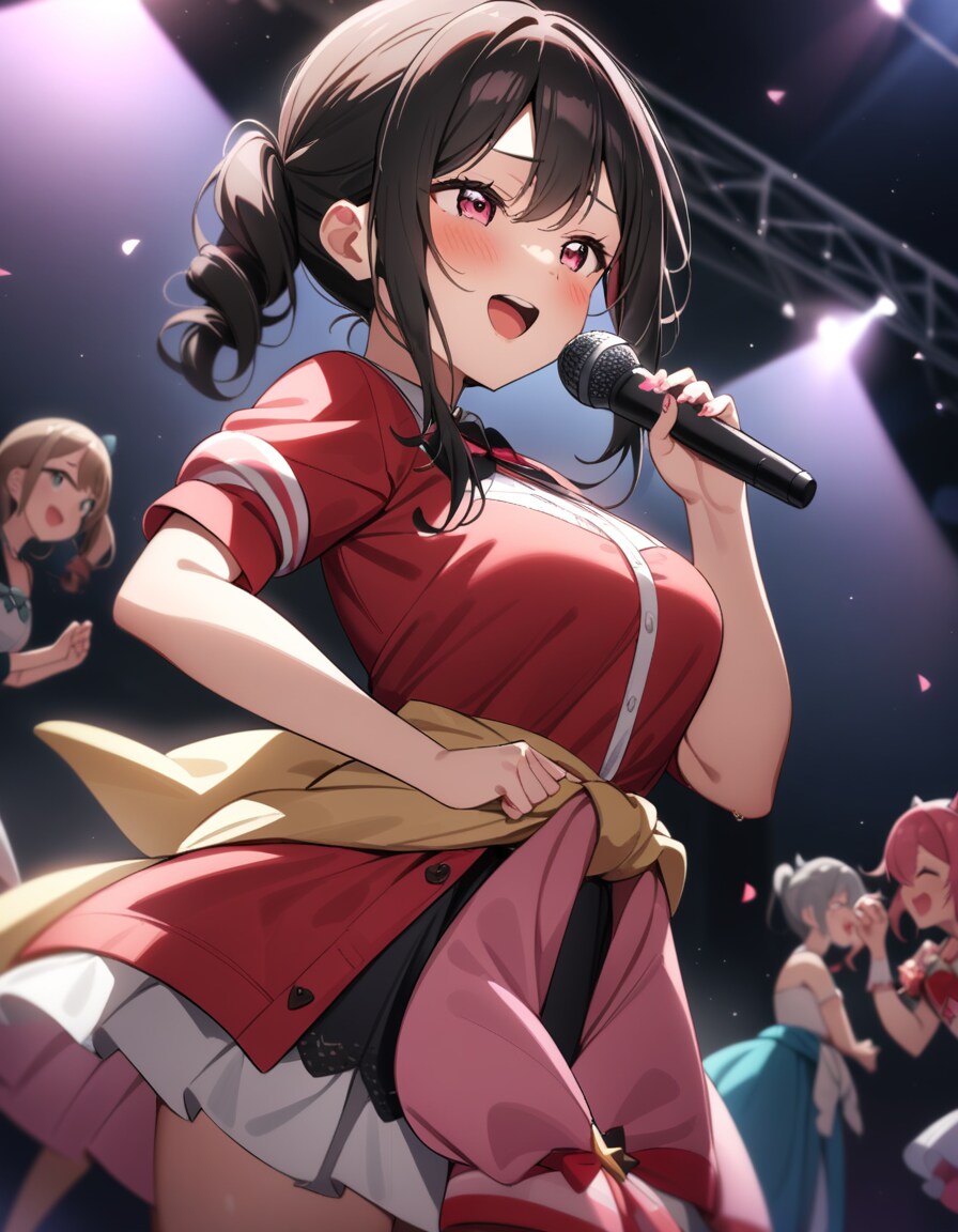 矢澤にこは、魔法少女服を腰に巻いて(腰結び)歌い踊っています。