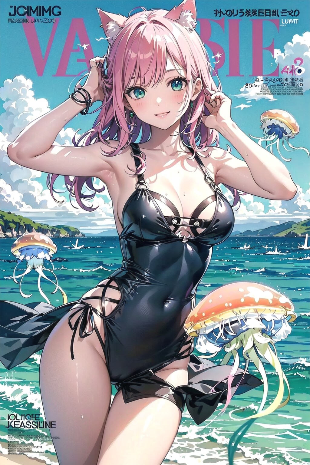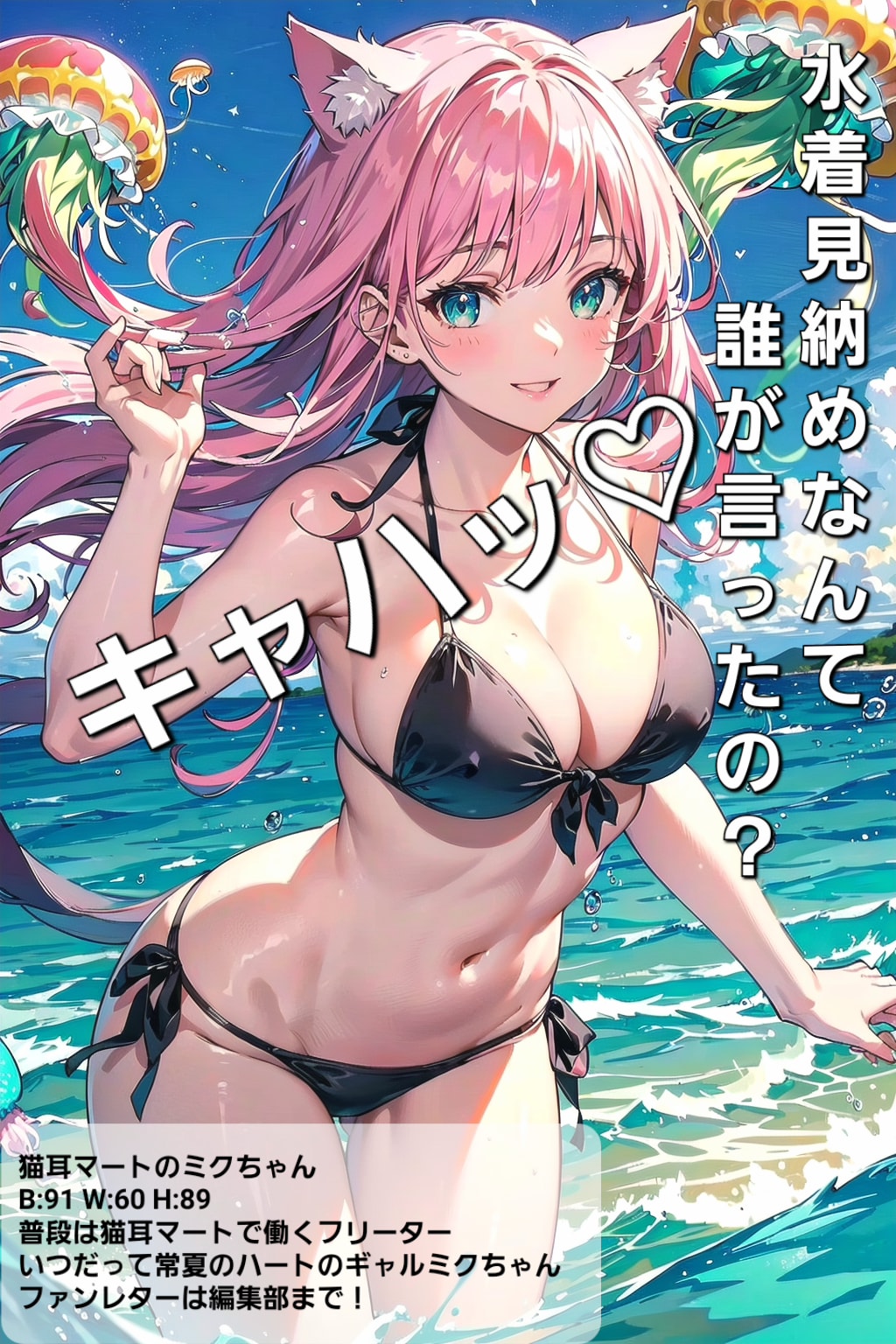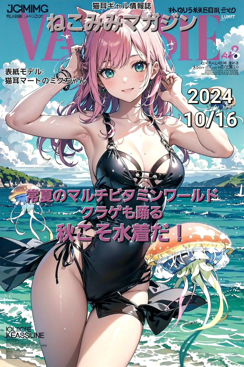 今回は、猫耳マートのミクちゃんが表紙で、謎の常夏世界「マルチビタミンワールド」にて、不思議な空飛ぶクラゲと共演するミクちゃんの水着グラビア特集です😋