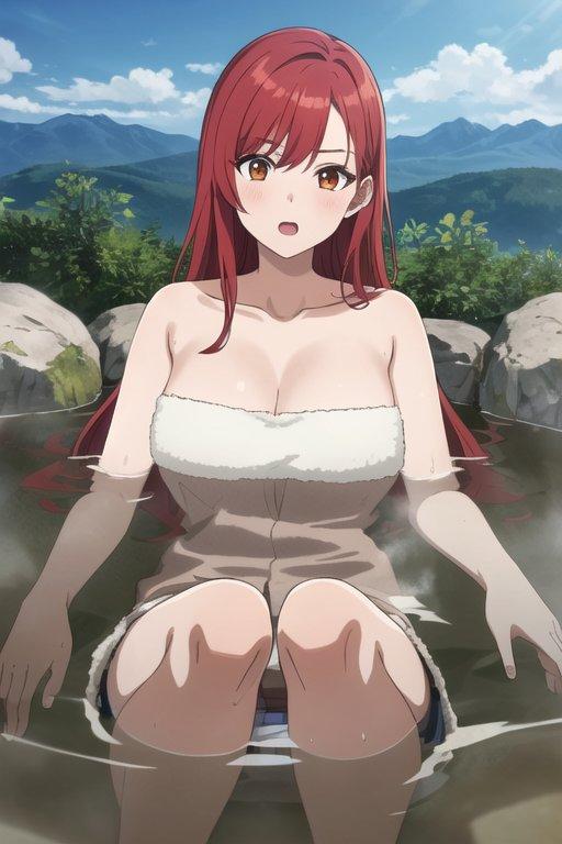 山の温泉を楽しんでいる女の子。