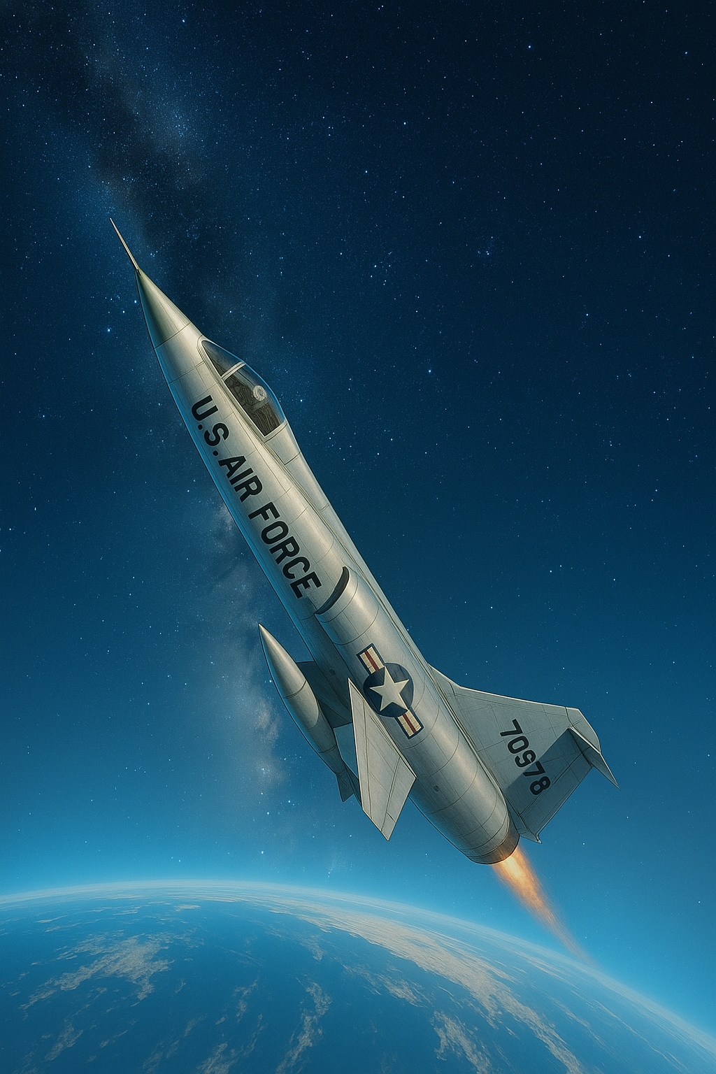飛行機に乗っていたテストパイロットたちは、皆、宇宙飛行士を目指すが、チャック・イエーガーは独り宇宙への転身を拒んでいた。ある日、空軍基地に配備された最新鋭機F104を見た彼は、高高度記録を目指し無許可で離陸、高度35000mに到達する。そこは成層圏の上限で、星のきらめく宇宙空間であった(1枚目)。これは今なお破られることのない航空機の到達した最高高度である。この直後、機体はコントロールを失い墜落する(未帰還なので高度記録として認められていない)