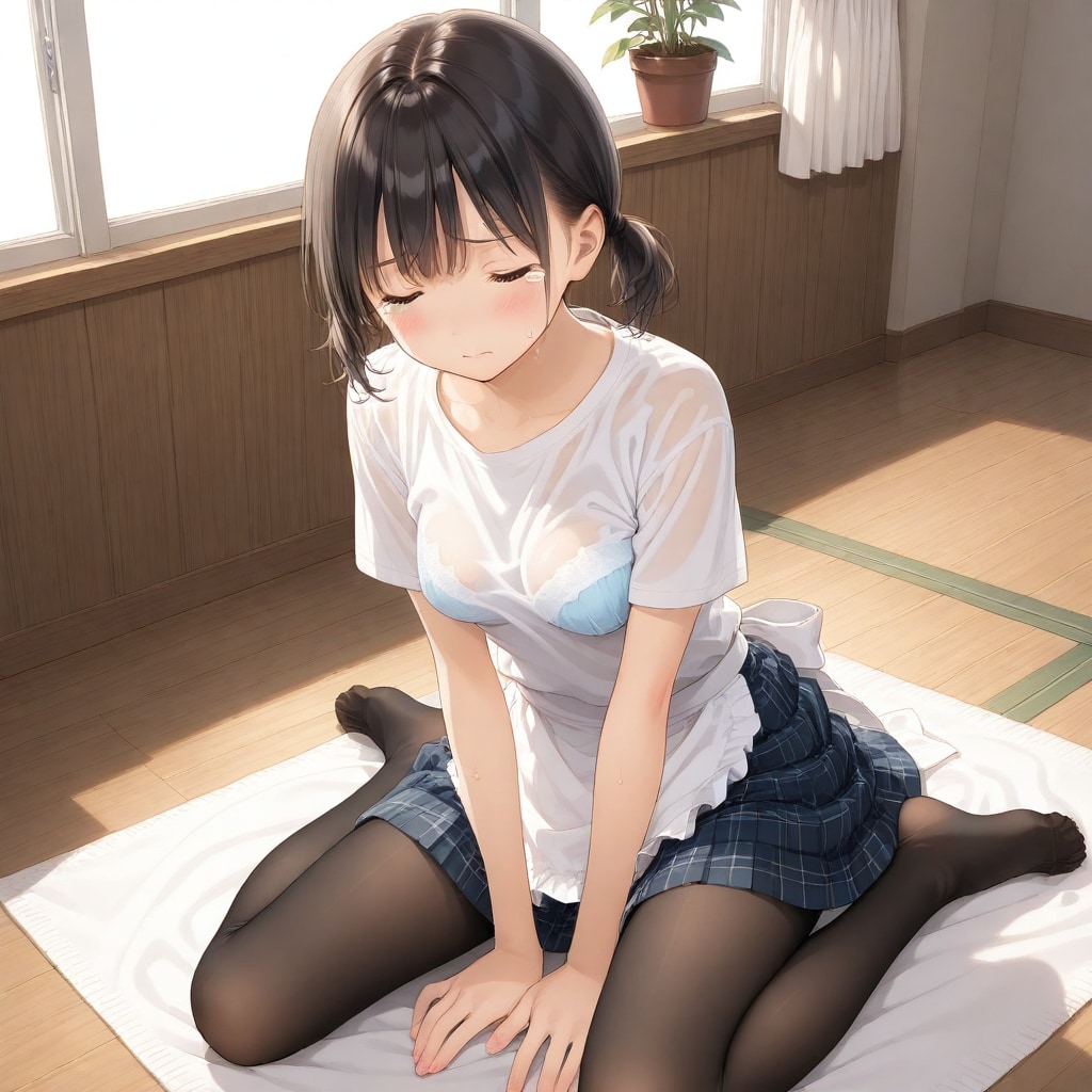 …やらかした〜、コップの水倒しちゃって。シャツびしょびしょだよぅ