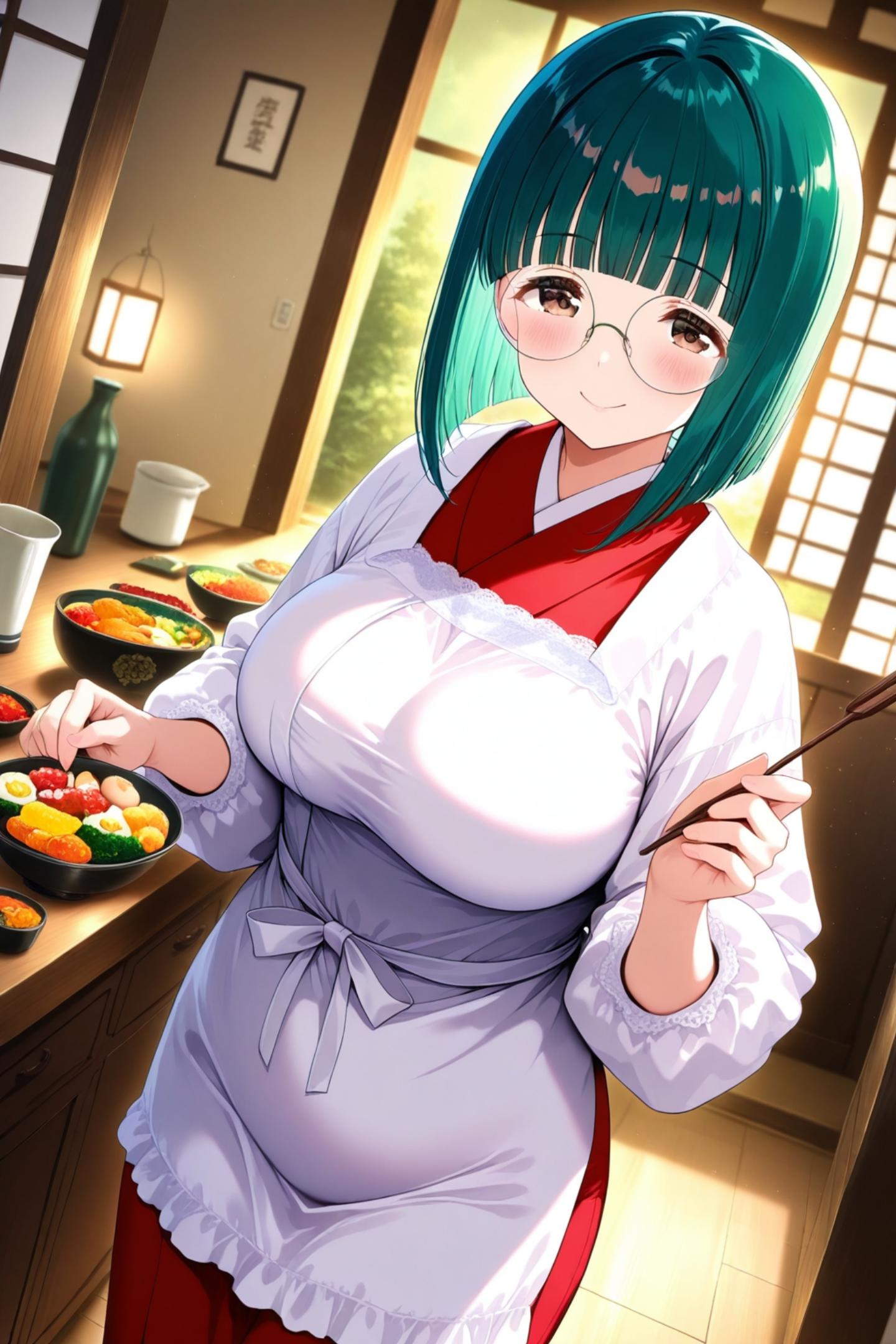 よもぎの母、九十式よもえは割烹着を着て夕食の支度をする。