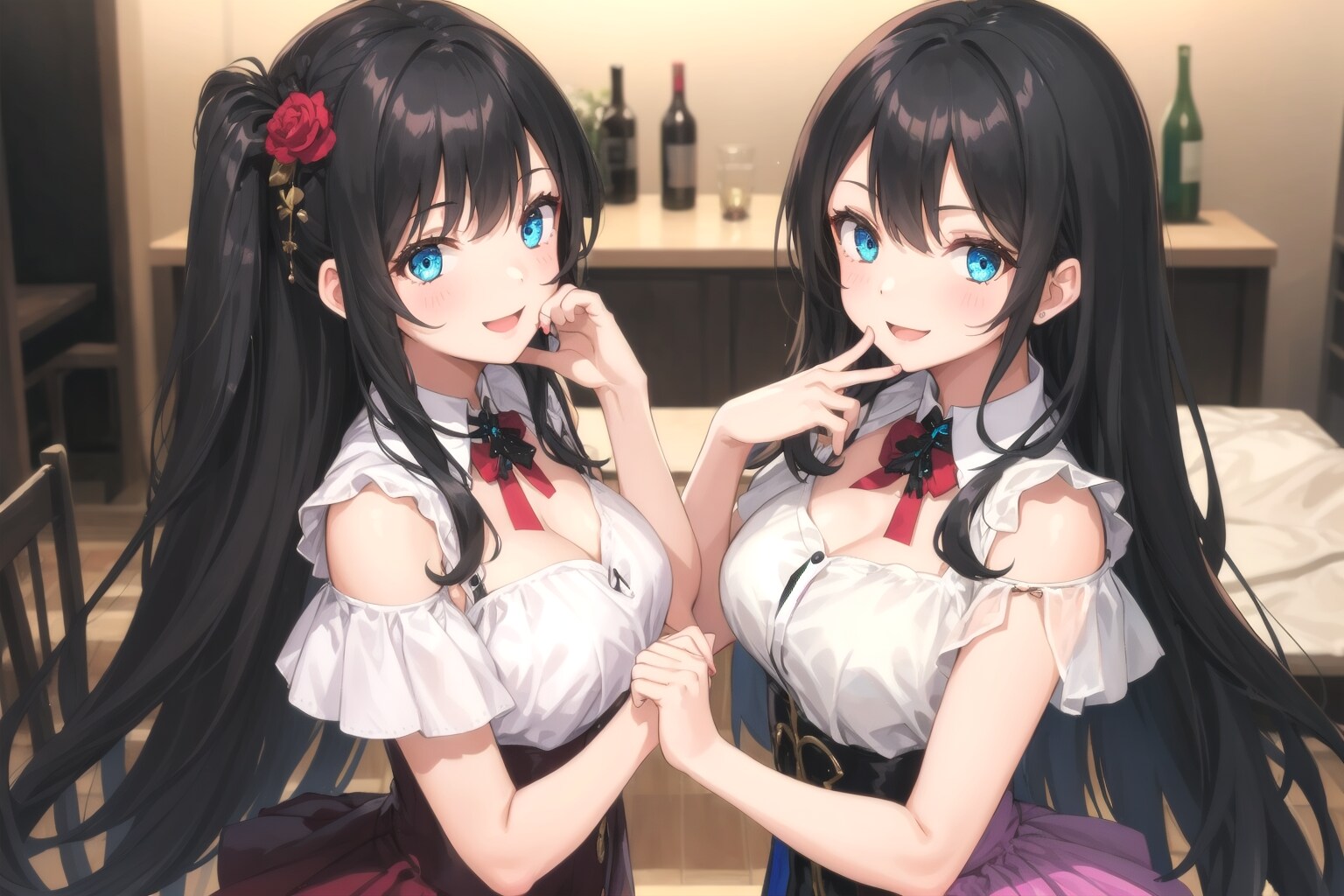 「 (two girls with A happy smile)」プロンプトで、満面の笑みを表現しました。