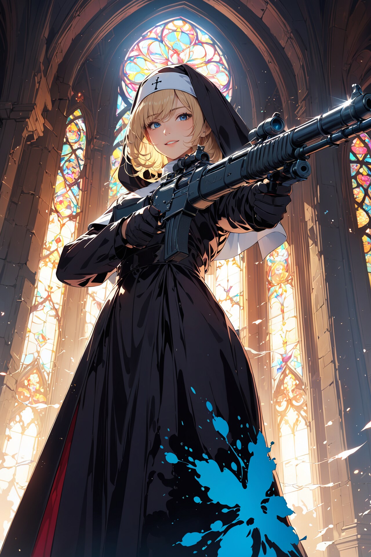 笑顔でいかつい銃を振り回すシスターを描こうと思いました。