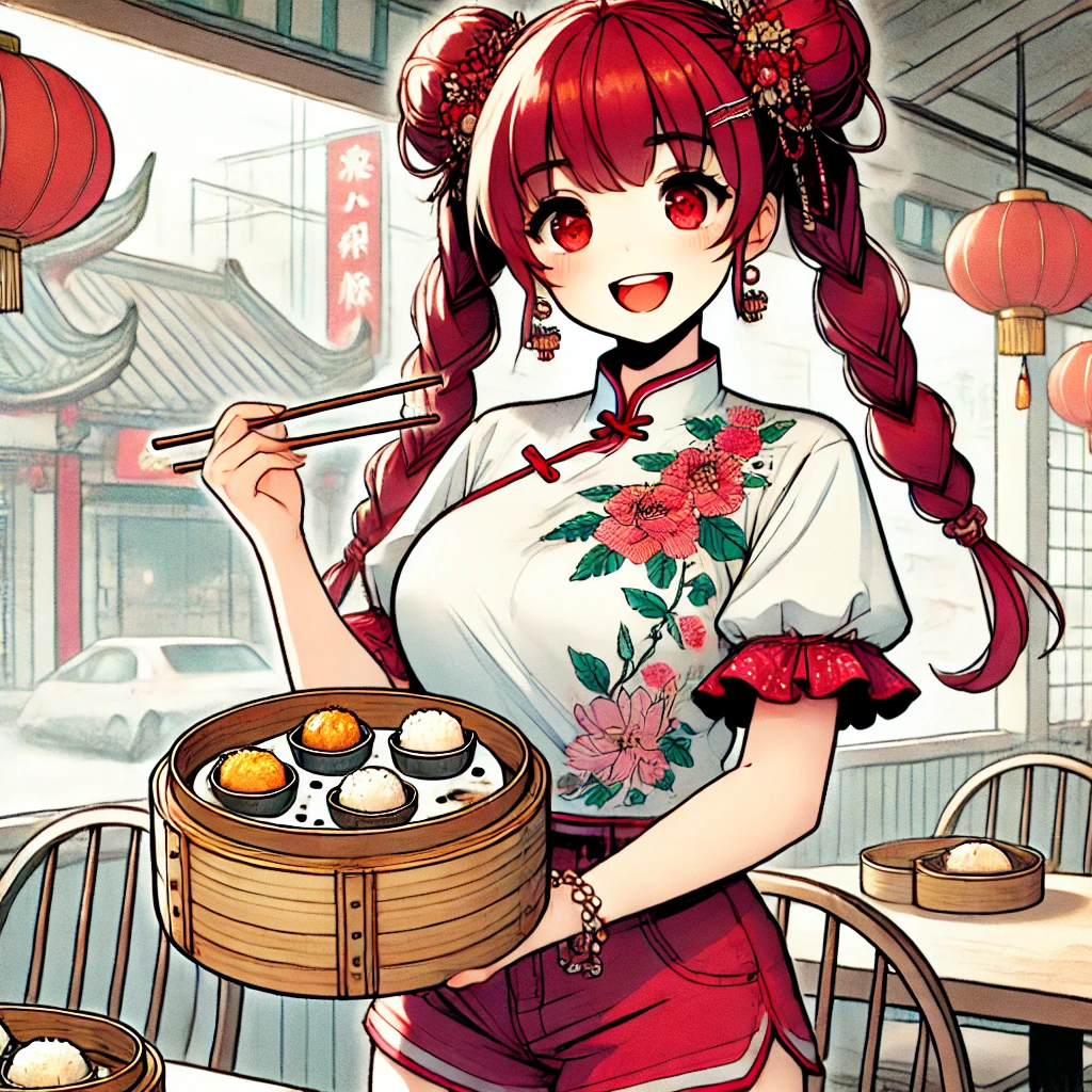 花刺繍入りのチャイナ風ブラウスとハイウエストパンツで登場する店長。点心の蒸籠を手に、明るい笑顔でポーズを取る。ファッション誌のような一枚。